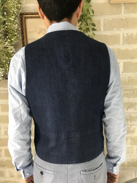 ステッチ入りノンウォッシュデニムのベスト。シリーズは、ジャケット、ベスト、パンツの3ピースの展開。パンツを白デニムで合わせてもおしゃれです。合わせるシャツを水色ネイビーのチェックシャツで合わせてカジュアルな二次会タキシードとしても素敵。また白のウィングカラーシャツを合わせればきちんとして爽やかなコーディネートになります。二次会の披露宴・結婚式・ゲスト結婚式の参列向け、パーティースーツ・二次会・海外ウェディング・海沿いの会場、リゾートウェディング・フォトウェディング、前撮りにまで幅広いシーンでご使用いただけます。