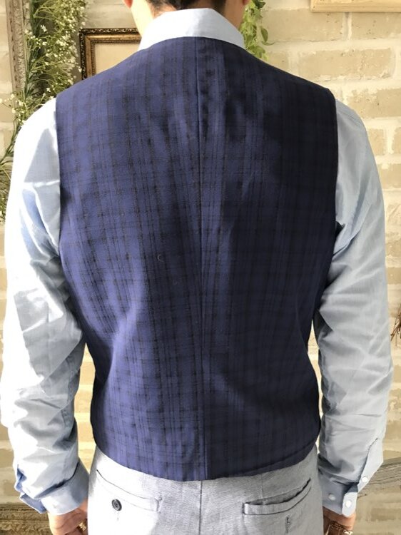 明るめなネイビーブルーのグレンチェック柄のベスト。同じシリーズはジャケット、ベスト、パンツの3ピース展開。パンツをセットではなく白デニムで合わせてもおしゃれです。合わせるシャツを水色やグレーシャツで合わせてカジュアルな二次会タキシードとしても素敵。また白のウィングカラーシャツを合わせればきちんとして爽やかなコーディネートになります。また裏地もカラフルなストライプカラーになっていておしゃれですよ。二次会の披露宴・結婚式・ゲスト結婚式の参列向け。パーティースーツ・二次会・海外ウェディング・海沿いの会場、リゾートウェディング・フォトウェディング、前撮りにまで幅広いシーンでご使用いただけます