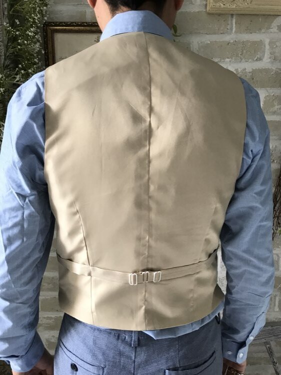 光沢のあるベージュゴールドのべすとです。セットのタキシードはYKJ023でホワイト。アイボリー(白)の光沢のあるタキシード。下襟の先がとがったピークドラぺルタイプ。ジャケット、パンツの2ピースタイプ。ベストはチェックやストライプ柄や、スモーキーピンク、ブラック、ブルーなどのベストを差し色として合わせるのもオススメです。合わせるシャツをチェック、ドット、ストライプ、花柄、ネイビー、ブラック、グレーシャツで合わせてカジュアルな二次会タキシードとしても素敵。また白のウィングカラーシャツを合わせればきちんとした結婚式や披露宴向けのフォーマルなコーディネートになります。披露宴・結婚式・パーティースーツ・二次会・海外ウェディング・フォトウェディング、前撮りにまで幅広いシーンでご使用いただけます。オールシーズンに適してます。
