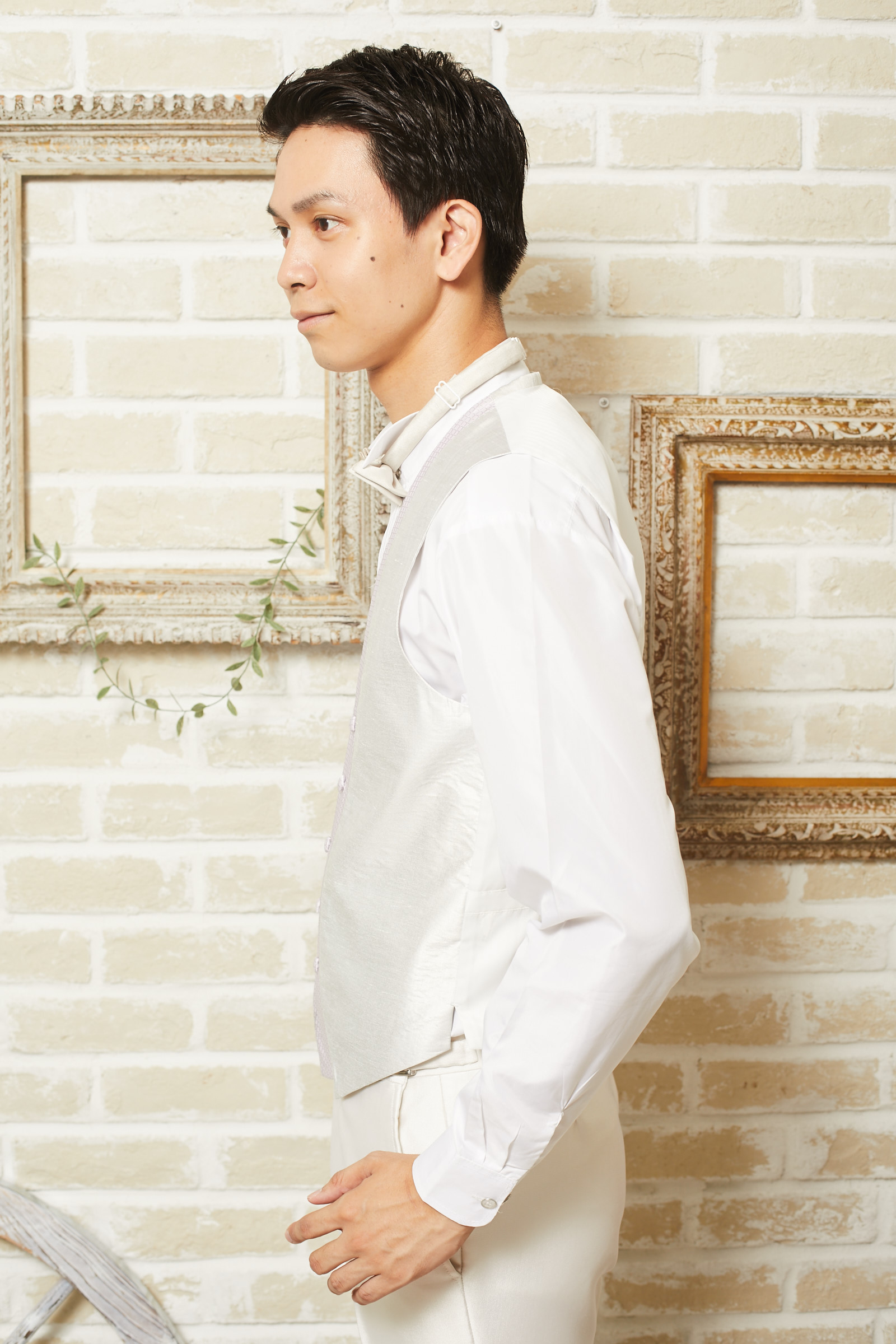 光沢のあるホワイト。アイボリー(白)のべすとです。セットのジャケットは同じく光沢のあるホワイト。アイボリー(白)のモーニングコート。下襟の先がとがったピークドラぺルタイプです。モーニングコートは昼間の時間帯で最も格式の高い正礼装です。シングルブレストという生地を重ねないい形でボタンは一つ。きちんと感を大切にされたい新郎様や非日常を味わいたい方にオススメのスタイルです。ジャケット、ベスト、パンツの3ピースタイプ。少しおしゃれなカジュアルに着崩すならベストはチェックやストライプ柄や、ワインレッド、ゴールド、シルバー、グレー、スモーキーピンク、ブラック、ブルーなどのベストを差し色として合わせるのもオススメです。合わせるシャツをチェック、ドット、ストライプ、花柄、ネイビー、ブラック、グレーシャツで合わせてカジュアルな二次会タキシードとしても素敵。また白のウィングカラーシャツを合わせればきちんとした結婚式や披露宴向けのフォーマルなコーディネートになります。披露宴・結婚式・パーティースーツ・二次会・海外ウェディング・フォトウェディング、前撮りにまで幅広いシーンでご使用いただけます。オールシーズンに適してます。
