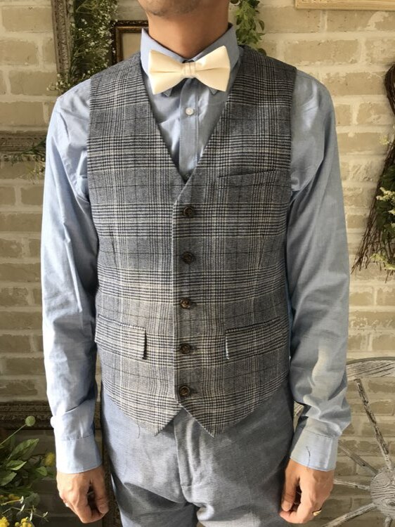 グレーのシェパードチェック柄のベスト。ベスト単品の展開です。ネイビー、グレー、ホワイト、ブラウン、ブラック、ワインレッド、ライトブルー、ピンクなど無地のジャケットやパンツならどんなカラーでも合わせやすい万能なチェックベストです。また合わせるシャツをデニム素材、細かなドット柄、ネイビー、ライトブルー、ライトグレーシャツで合わせてカジュアルな二次会タキシードとしても素敵。また白のウィングカラーシャツを合わせればきちんとした結婚式や披露宴向けのフォーマルなコーディネートになります。披露宴・結婚式・ゲスト結婚式の参列向け。パーティースーツ・二次会・海外ウェディング・フォトウェディング、前撮りにまで幅広いシーンでご使用いただけます。オールシーズンに適してます。