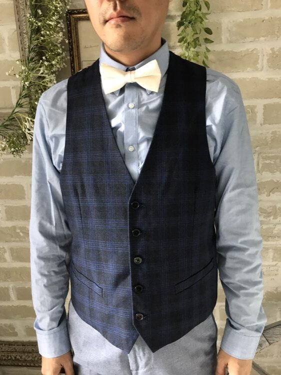 ネイビーにブルーのチェック柄のベスト。同じシリーズでは、YKJ038のジャケットとパンツの3ピースのセット展開です。セット以外でも、ネイビー、グレー、ホワイト、ブラウン、ブラック、ワインレッド、ライトブルー、ピンクなど無地のジャケットやパンツならどんなカラーでも合わせやすい万能なチェックベストです。また合わせるシャツをデニム素材、細かなドット柄、ネイビー、ライトブルー、ライトグレーシャツで合わせてカジュアルな二次会タキシードとしても素敵。また白のウィングカラーシャツを合わせればきちんとした結婚式や披露宴向けのフォーマルなコーディネートになります。披露宴・結婚式・ゲスト結婚式の参列向け。パーティースーツ・二次会・海外ウェディング・フォトウェディング、前撮りにまで幅広いシーンでご使用いただけます。オールシーズンに適してます。