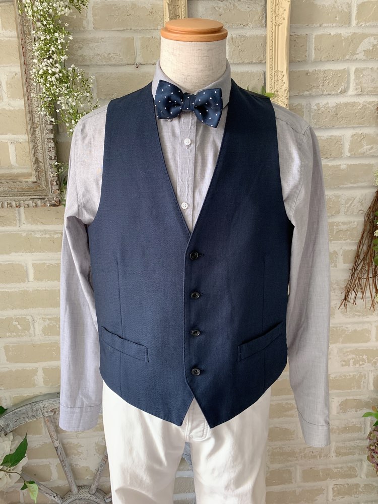 ネイビーのシンプルで何にでも合わせやすいオールシーズン向けのベスト。サイズはかなり小さめでXSの方にちょうどいいです。このベストは単品の展開です。ネイビー、グレー、ホワイト、ブラックなど無地のジャケットや、パンツはホワイトデニムや、グレー、ブラック、ネイビーの無地パンツでも合わせやすい万能なチェックベストです。また合わせるシャツをデニム素材、細かなドット柄、ネイビー、ライトブルー、ライトグレーシャツで合わせてカジュアルな二次会タキシードとしても素敵。また白のウィングカラーシャツを合わせればきちんとした結婚式や披露宴向けのフォーマルなコーディネートになります。披露宴・結婚式・ゲスト結婚式の参列向け。パーティースーツ・二次会・海外ウェディング・フォトウェディング、前撮りにまで幅広いシーンでご使用いただけます。オールシーズンに適してます。