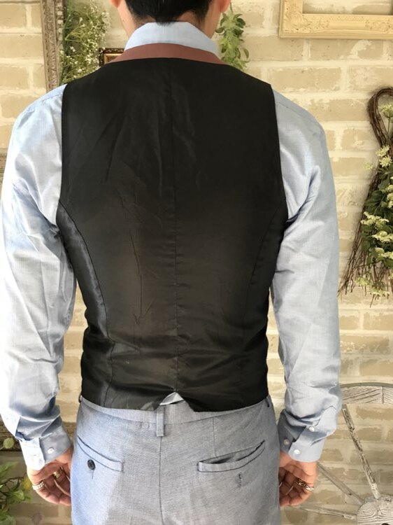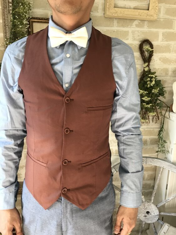 赤茶(ブラウン)無地のオールシーズン向けのベス。このベストは単品の展開です。ブラウン、ベージュ、グリーン、ネイビー、グレー、ホワイト、ブラックなど無地のジャケットや、パンツはホワイトデニムや、グレー、ブラック、ネイビーの無地パンツでも合わせやすい万能なチェックベストです。また合わせるシャツをデニム素材、細かなドット柄、ネイビー、ライトブルー、ライトグレーシャツで合わせてカジュアルな二次会タキシードとしても素敵。また白のウィングカラーシャツを合わせればきちんとした結婚式や披露宴向けのフォーマルなコーディネートになります。披露宴・結婚式・ゲスト結婚式の参列向け。パーティースーツ・二次会・海外ウェディング・フォトウェディング、前撮りにまで幅広いシーンでご使用いただけます。オールシーズンに適してます。
