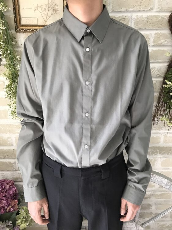 カーキのコットン混素材の長袖シャツ。ネイビー、ベージュ、グレー、ブラック、イエローチェックのタキシードやジャケットと相性良いですイージーアイロン加工。ターンダウンカラー。フロントはクラシカルなスタイル。細いカフス付きで、袖口周りをボタンで調節できます。バックにダーツ入り。裾はラウンドカット。スリムフィット―肩幅が狭めで、ウエストを絞った細身のフィット。ボディラインに沿ったシルエットを創り出します。