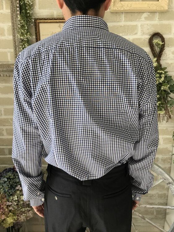 青×白(ブルー×ホワイト)のギンガムチェック柄のコットン混素材の長袖シャツ。ネイビー、ベージュ、グレー、ブラック、イエローチェックのタキシードやジャケットと相性良いですイージーアイロン加工。ターンダウンカラー。フロントはクラシカルなスタイル。細いカフス付きで、袖口周りをボタンで調節できます。バックにダーツ入り。裾はラウンドカット。スリムフィット―肩幅が狭めで、ウエストを絞った細身のフィット。ボディラインに沿ったシルエットを創り出します。
