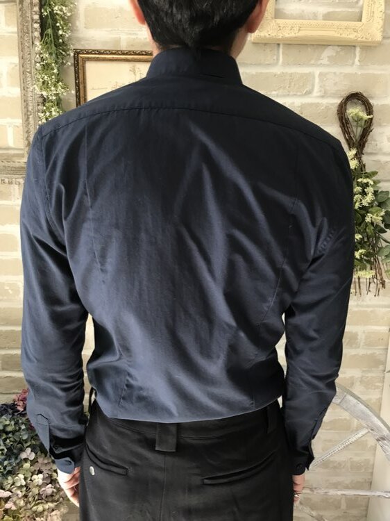 ネイビーのコットン混素材の長袖シャツ。ブラック、ネイビー、ベージュ、グレー、ワインレッド、イエローやチェック柄やストライプ柄のタキシードやジャケットと相性良いです。イージーアイロン加工。ターンダウンカラー。フロントはクラシカルなスタイル。細いカフス付きで、袖口周りをボタンで調節できます。バックにダーツ入り。裾はラウンドカット。スリムフィット―肩幅が狭めで、ウエストを絞った細身のフィット。ボディラインに沿ったシルエットを創り出します。