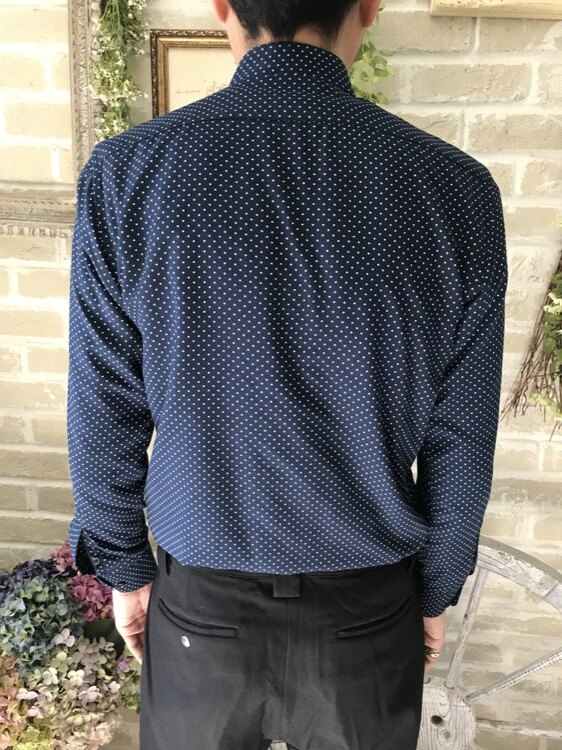 ネイビードット柄BLACK LABELのコットン混素材の長袖シャツ。ブラック、ネイビー、ベージュ、グレー、ワインレッド、チェック柄やストライプ柄のタキシードやジャケットと相性良いです。イージーアイロン加工。ターンダウンカラー。フロントはクラシカルなスタイル。細いカフス付きで、袖口周りをボタンで調節できます。バックにダーツ入り。裾はラウンドカット。スリムフィット―肩幅が狭めで、ウエストを絞った細身のフィット。ボディラインに沿ったシルエットを創り出します。