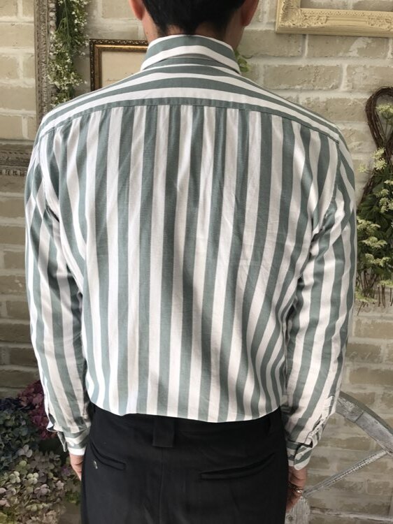 グリーン×ホワイトのストライプ柄でコットンの長袖シャツ。ターンダウンカラーで、フロントはクラシカルなスタイル。。ネイビー、グレー、ホワイト、グリーン、ブラウン、ベージュ、ブラックの無地のタキシードやジャケットと相性良いです。裾はラウンドカット。レギュラーフィット―動きやすいゆとりがあり、ウエスト部分をゆるやかに絞ったクラシックなフィット。着心地のよいテーラードシルエットを創り出します。
