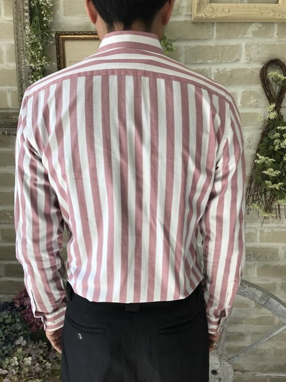 グリーン×ホワイトのストライプ柄でコットンの長袖シャツ。ターンダウンカラーで、フロントはクラシカルなスタイル。。ネイビー、グレー、ホワイト、グリーン、ブラウン、ベージュ、ブラックの無地のタキシードやジャケットと相性良いです。裾はラウンドカット。レギュラーフィット―動きやすいゆとりがあり、ウエスト部分をゆるやかに絞ったクラシックなフィット。着心地のよいテーラードシルエットを創り出します。