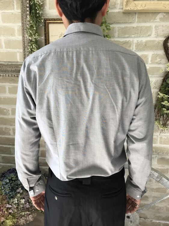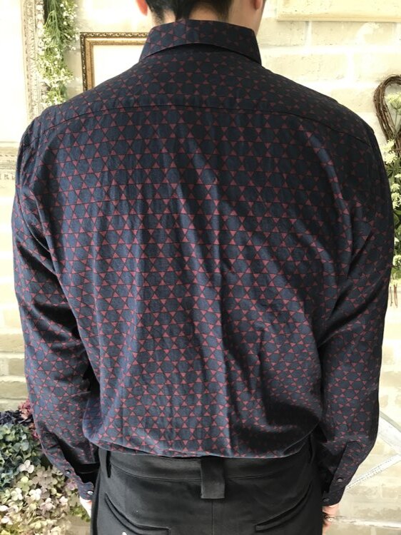ネイビー×ワインレッドのドットのような幾何学柄のコットン混素材の長袖シャツ。ブラックホワイト、、ネイビー、ベージュ、グレー、ワインレッドの無地タキシードやジャケットと相性良いですイージーアイロン加工。ボタンダウンシャツ。フロントはクラシカルなスタイル。細いカフス付きで、袖口周りをボタンで調節できます。バックにダーツ入り。裾はラウンドカット。スリムフィット―肩幅が狭めで、ウエストを絞った細身のフィット。ボディラインに沿ったシルエットを創り出します。