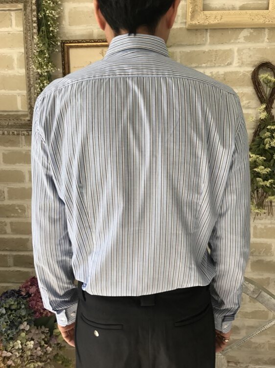 ライトブルー×ホワイトのマルチストライプ柄でコットンの長袖シャツ。ターンダウンカラーで、フロントはクラシカルなスタイル。イージーアイロン加工でシワいらず。ネイビー、グレー、ホワイト、グリーン、ブラウン、ベージュ、ブラックの無地のタキシードやジャケットと相性良いです。裾はラウンドカット。レギュラーフィット―動きやすいゆとりがあり、ウエスト部分をゆるやかに絞ったクラシックなフィット。着心地のよいテーラードシルエットを創り出します。