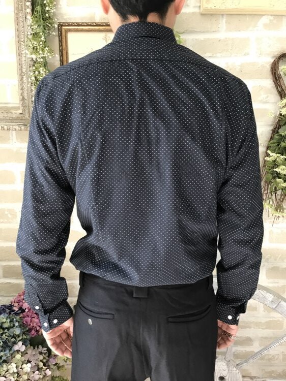 ブラックに細かいホワイトのドット柄のコットンの長袖シャツ。ターンダウンカラーで、フロントはクラシカルなスタイル。イージーアイロン加工でシワいらず。ホワイト、ライトブルー、水色、ネイビー、グレー、グリーン、ピンク、ブラウン、ベージュ、ブラックの無地のタキシードやジャケットと相性良いです。裾はラウンドカット。レギュラーフィット―動きやすいゆとりがあり、ウエスト部分をゆるやかに絞ったクラシックなフィット。着心地のよいテーラードシルエットを創り出します。