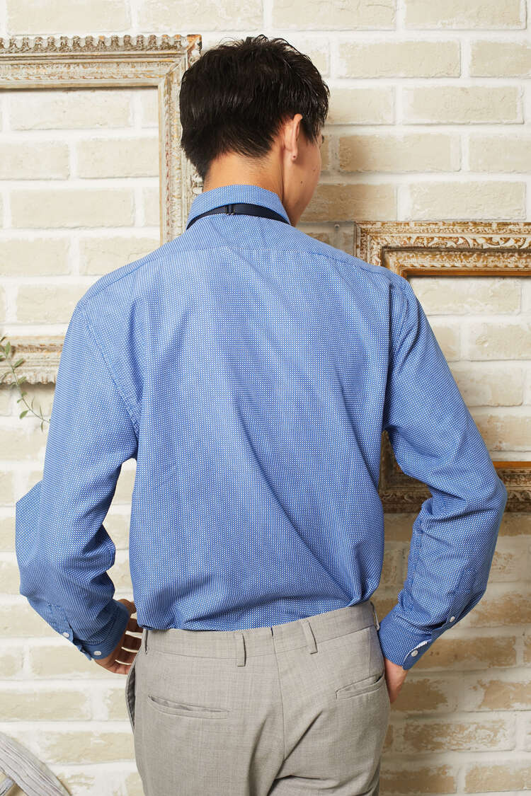 ライトブルー(水色)に細かいホワイトのドット柄のNICOLE MILLERのコットンの長袖シャツ。ターンダウンカラーで、フロントはクラシカルなスタイル。イージーアイロン加工でシワいらず。ホワイト、ライトブルー、水色、ネイビー、グレー、グリーン、ピンク、ブラウン、ベージュ、ブラックの無地のタキシードやジャケットと相性良いです。裾はラウンドカット。レギュラーフィット―動きやすいゆとりがあり、ウエスト部分をゆるやかに絞ったクラシックなフィット。着心地のよいテーラードシルエットを創り出します。