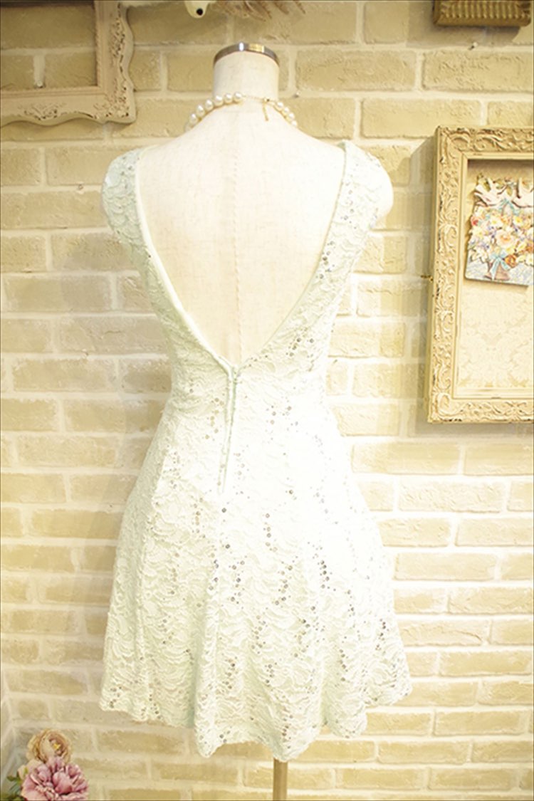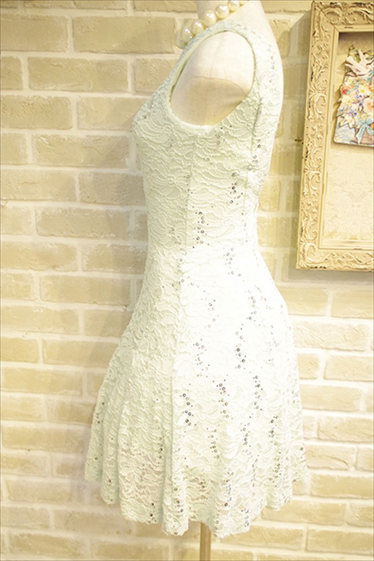 全体のレースとキラキララメが印象的なミントグリーンカラーのドレスです。背中は大きくV字にあいていてセクシーです。ウェストラインを綺麗に見せてくれて、脚長効果もあるドレスで、おしゃれな大人のドレススタイルをお楽しみいただけます。 小物はイエローやビビッドピンクと相性が良く、差し色を入れたコーデがおすすめです。