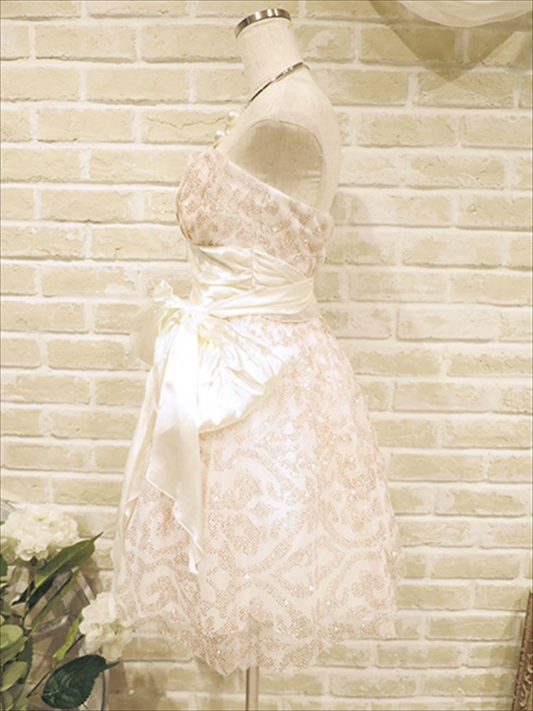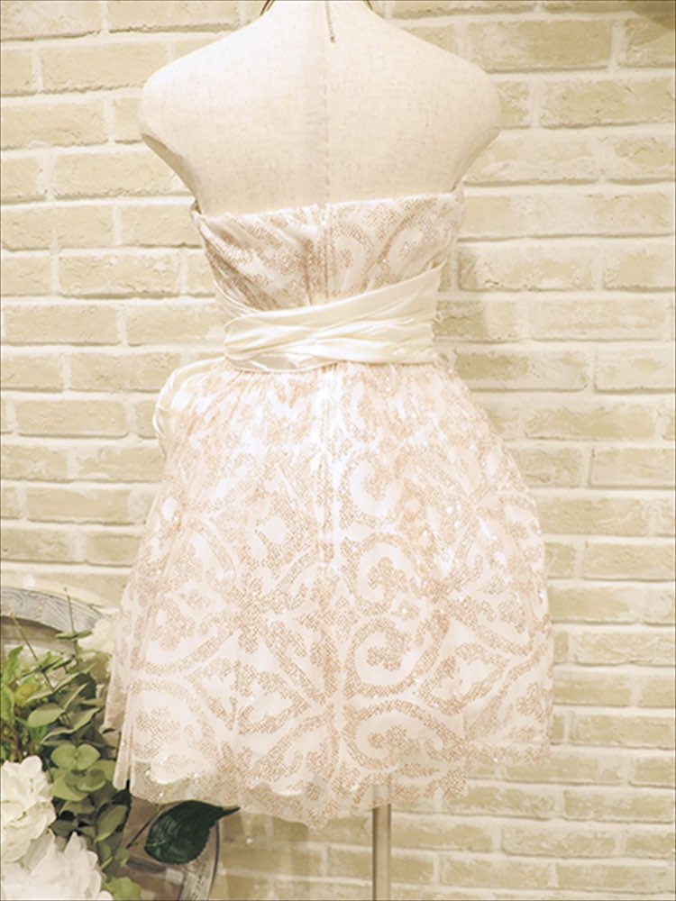 ドレス全体に入ったゴールドのキラキラの柄がとっても印象的で、花嫁さんの二次会やリムジンパーティー謝恩会向けののベアドレスです。ウェスト切り替えなので脚長効果と着痩せ効果抜群のフレアベアットップドレスです。パニエを入れるとよりふわっとして華やかになりますよ。ミニ丈なので花嫁二次会や謝恩会パーティーにオススメです。