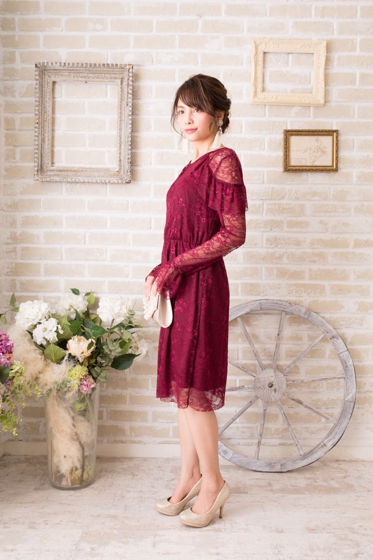 全レースがワンランク上の大人なボルドーカラーが印象的な長袖付きのドレス。着丈は膝上丈で、ウェスト切り替えのドレスなので着やせ効果も◎。全レース柄と透け感のある袖が一段とお洒落に磨きがかかり素敵♪ 着心地にもこだわり、ほどよいゆったり感で座ったときの少し突っ張るような感覚を軽減。 シワになりにくい点も、座る時間の長い披露宴などにオススメです。 コーディネートが苦手な方も羽織物なしで品よく決まりますよ!