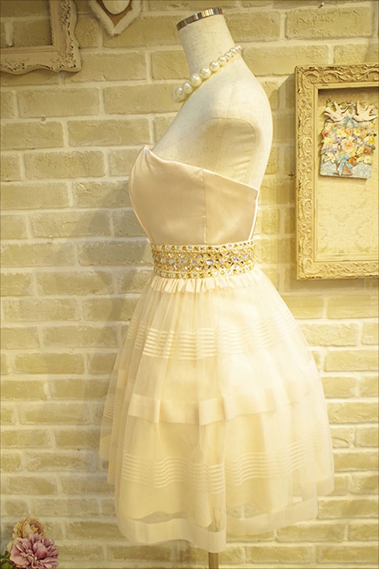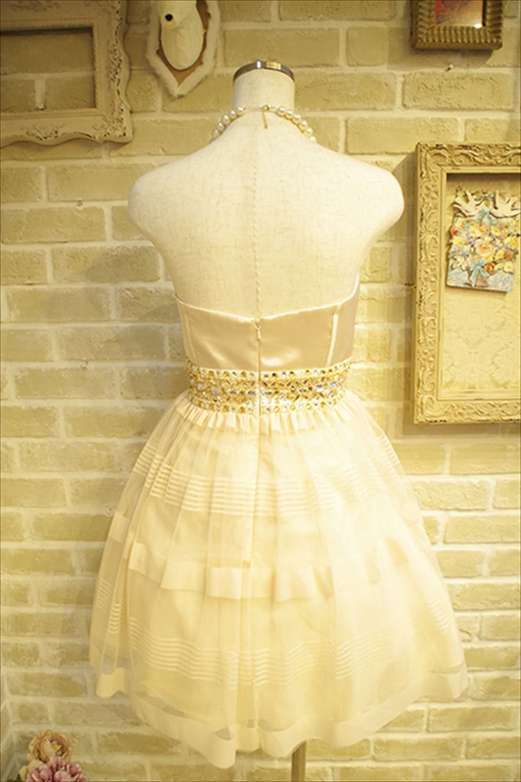 ウェストについたゴールドのキラキララビジューが華やかで、スカートのボーダーがとってもかわいいベアミニフレアドレスです。パニエを入れるとよりふわっとして華やかになりますよ。ミニ丈なので結婚式二次会や謝恩会パーティーにオススメです。