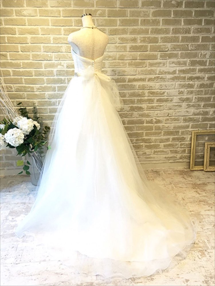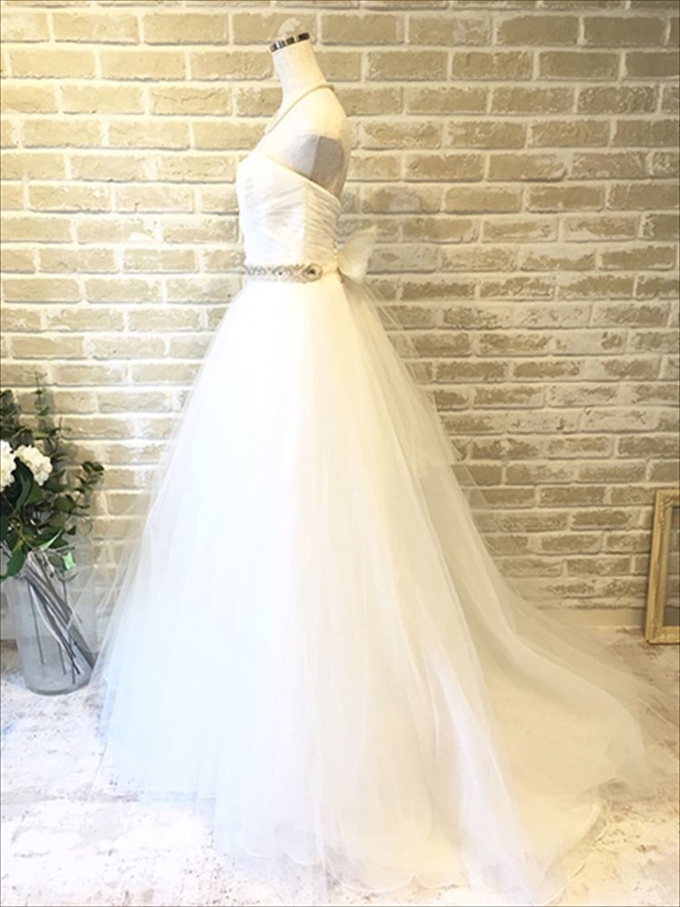 シンプルな王道のAラインドレスです。全体がチュール素材なので可憐な印象をあたえます。サッシュベルトを巻いて彩りを足したり、パニエを履いてボリューム感を出したりしても素敵です。 ベアタイプなのでお顔まわりがスッキリとして、小顔効果も抜群です♪ 一生に一度の機会にぜひ、このラグジュアリーなドレスを選んでみてはいかがでしょうか。
