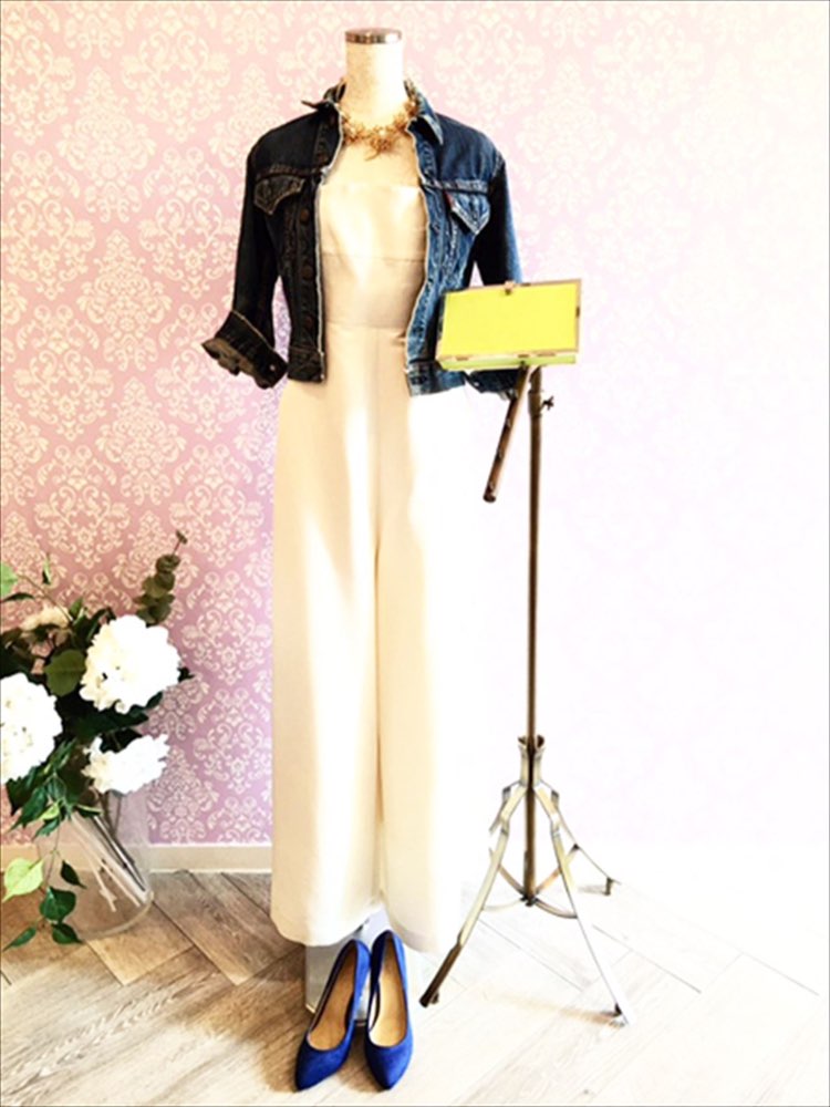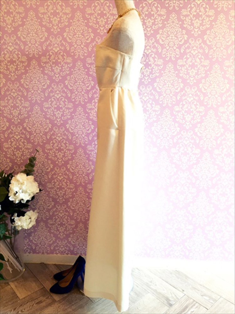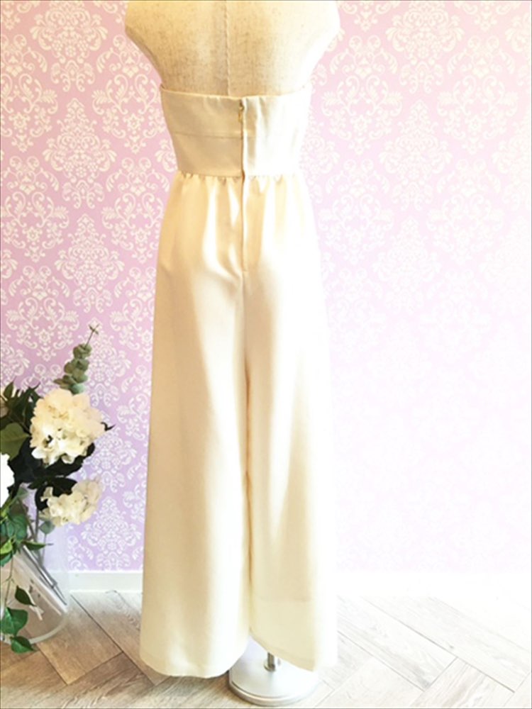 お洒落に敏感な女性にも納得いただけるであろう素敵なパンツドレス。スタイリッシュでありながら、女性らしい大人可愛い雰囲気も兼ね備えた一着。着心地の良さはもちろんのこと、ベアタイプなのでシャープでスッキリとした印象で小顔効果を発揮。 高めに位置されたウエストデザインにはサッシュベルトをONしてもOK!◎ 脚長効果を実現させ、トレンド感溢れるワイドパンツは、颯爽と歩きたくなってしまいますね。 結婚式のお色直しや二次会はもちろん、各種パーティーにもぴったりです。