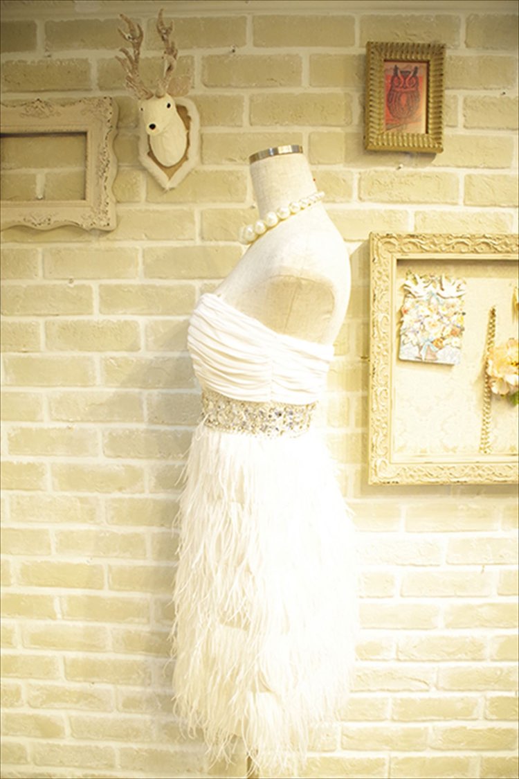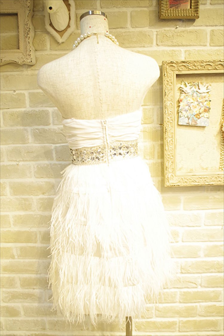 真っ白ののふわふわのリアルフェザーが印象的な花嫁さんの二次会ドレスやパティーにもオススメなドレスです。ウェストについたビジューとっても華やかでかわいいです。。高いウェスト位置に切り替えになっているので脚長効果も抜群です。あまり被ることの少ないリア春なふわふあのフェザーてまるで天使のような雰囲気です。シルエットが広がらないタイプなので可愛すぎず大人かわいい絶妙なバランスのドレスです。