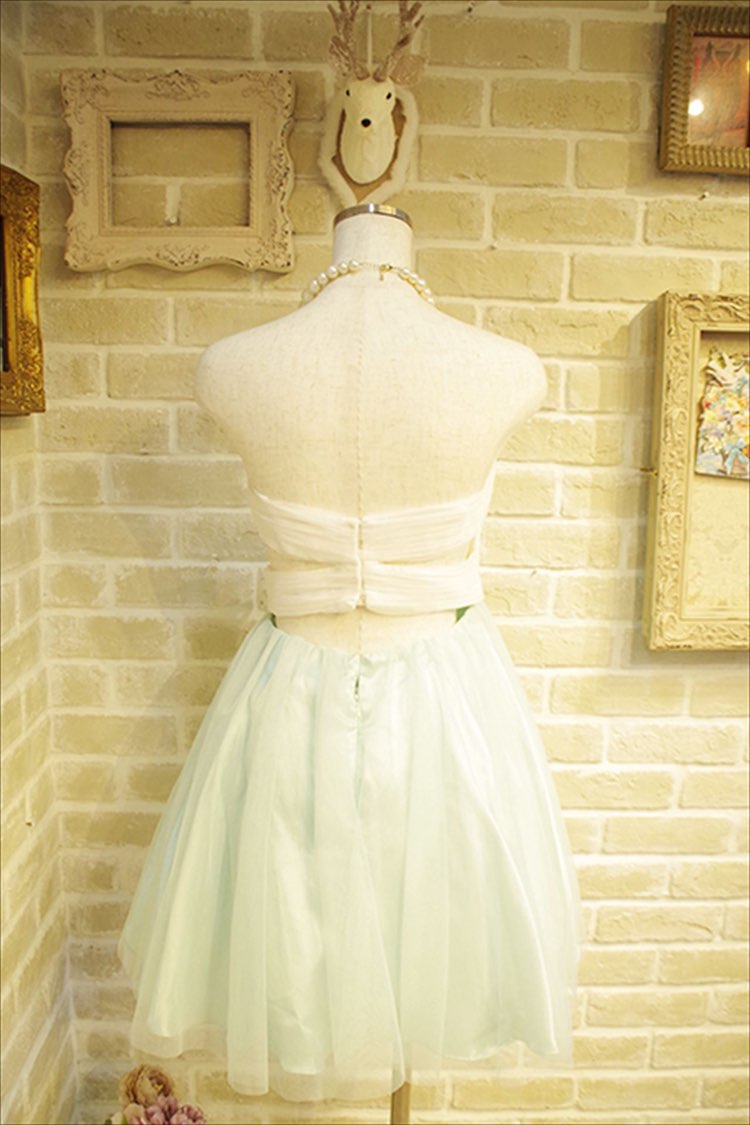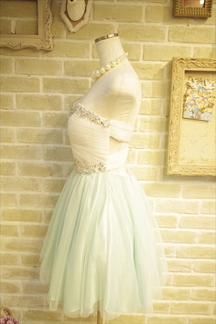 ホワイト×ミントグリーンのバイカラーがおしゃれなミニドレスです。胸元とウェストに付いたビジューがとっても華やかでかわいいです。。高いウェスト位置に切り替えになっているので脚長効果も抜群です。さらにほっそり見えるようにウェストにキラキラのビジューも付いています。パニエを入れることでよりふわっとして華やかになりますよ