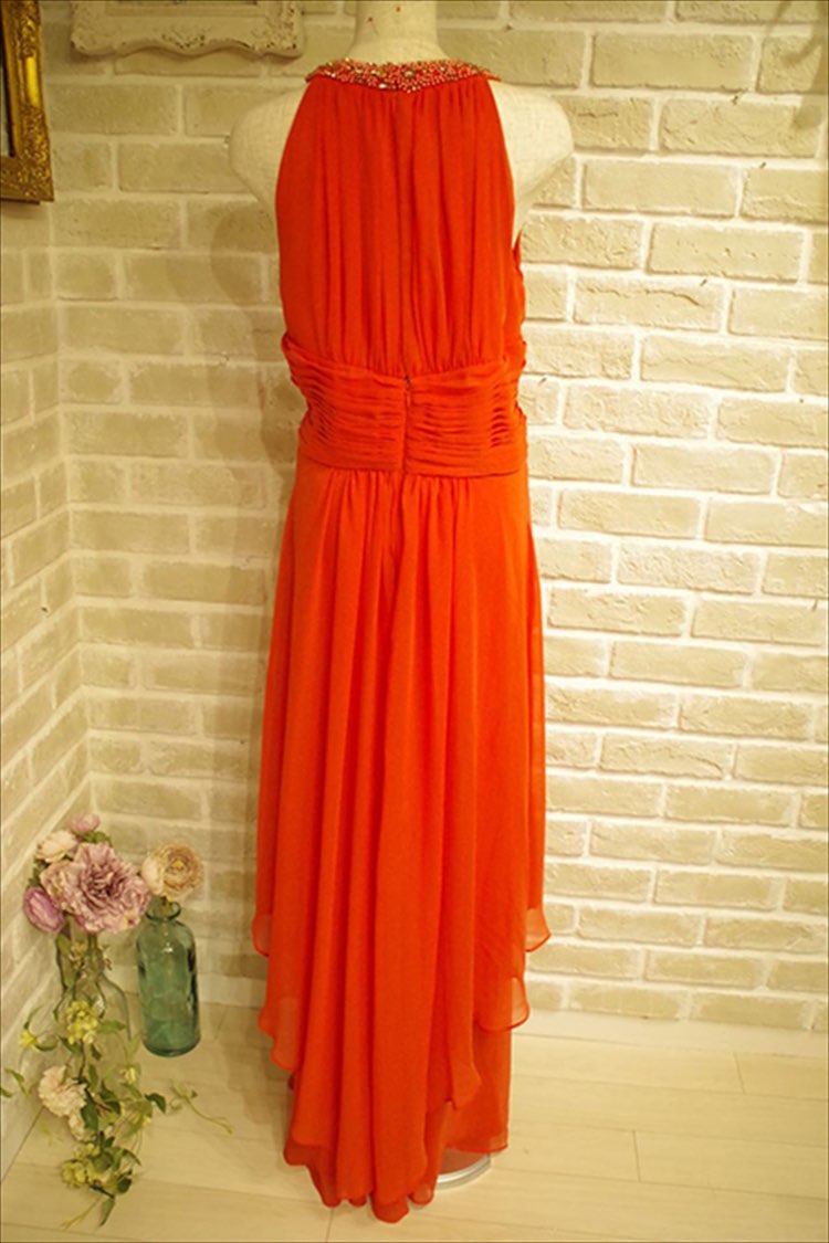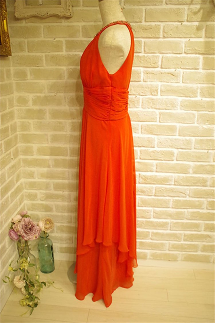 優雅で美しいシルエットで魅了するアプリコットカラーのドレス。首元にあしらわれたビジューが上品で華やかな女性らしい色気を漂わせます。着丈長めのバッグスタイルで360度エレガントに、特別感を演出。 シフォン素材で身体のラインを綺麗に演出、しなやかな着こなしをお楽しみいただけます。 ショールと合わせた、さらに艶やかなコーディネートがお勧め。 ナイトウエディングやパーティー、発表会などのシーンを華やかに彩ってくれる一着です。