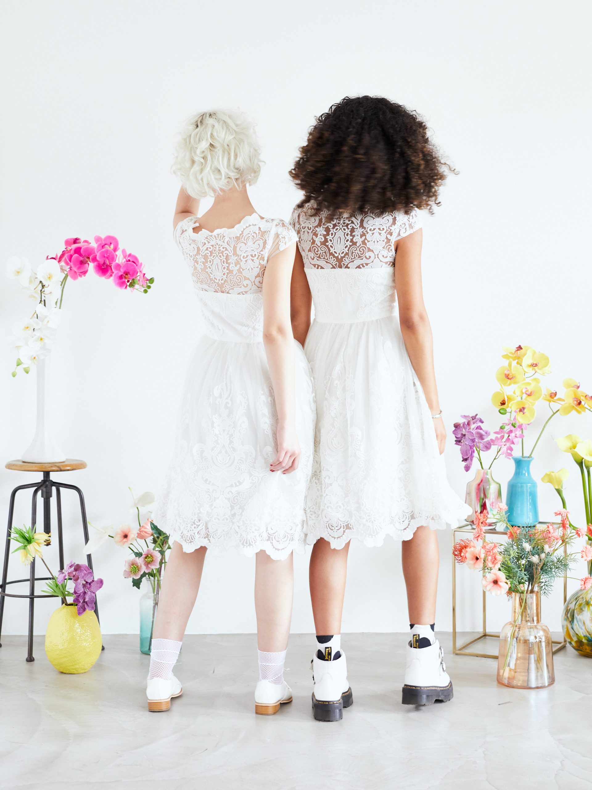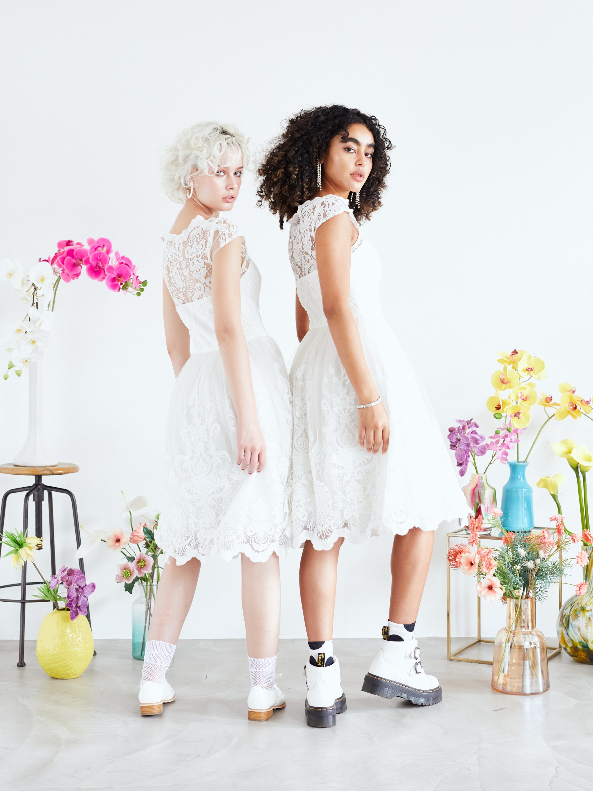 キャップスリーブの露出控えめドレス。ドレス全体に施された大柄の刺繍がとても華やかで主役感満載。ミニ丈やロング丈とはまた違った、大人っぽさと可愛らしさが混在したクラシカルでレディライクな雰囲気を演出してくれるミディアム丈は年々人気上昇中。当店では特にこのタイプが大人気です。ふんわり程よいスカートのボリューム感と年齢層を選ばないデザイン、飲食店等でのカジュアルな2次会にもOKな生地感。新婦様の2次会ドレスやお披露目パーティーなど、最高の日に是非オススメしたいホワイトドレスです。膝下のミディアム丈スカートは、少し高めのヒールでバランスをとるのが美しく見せポイント。