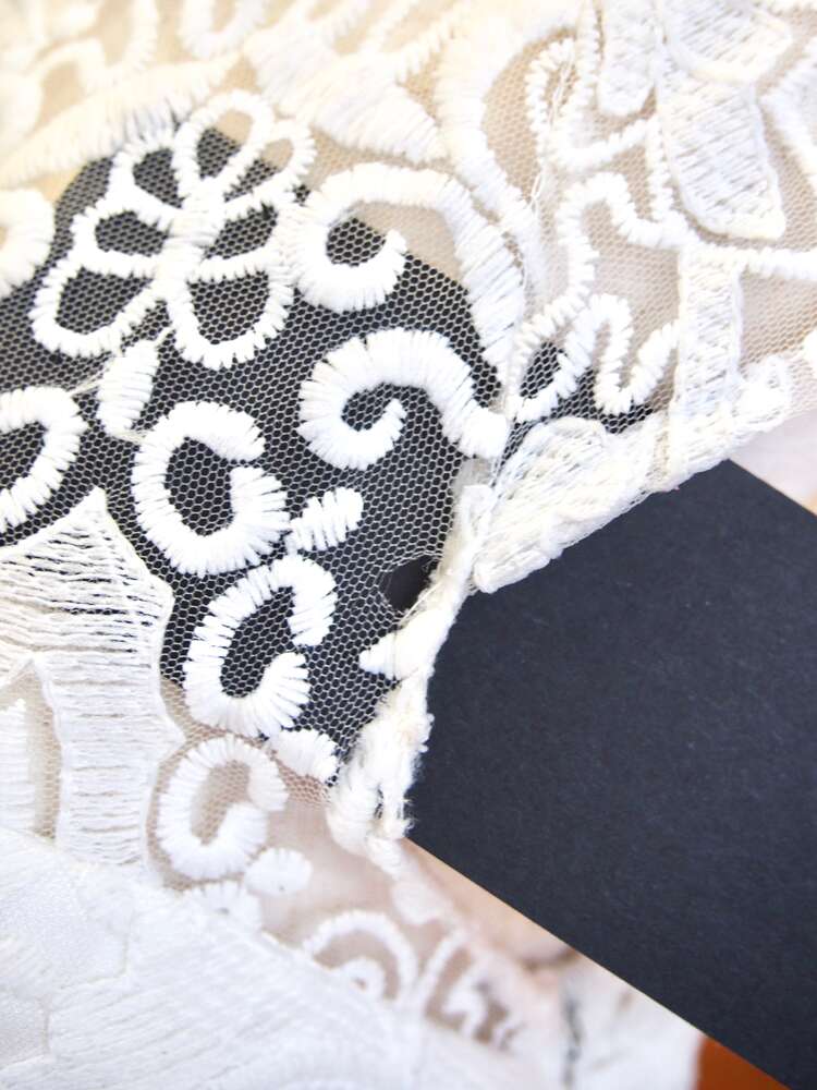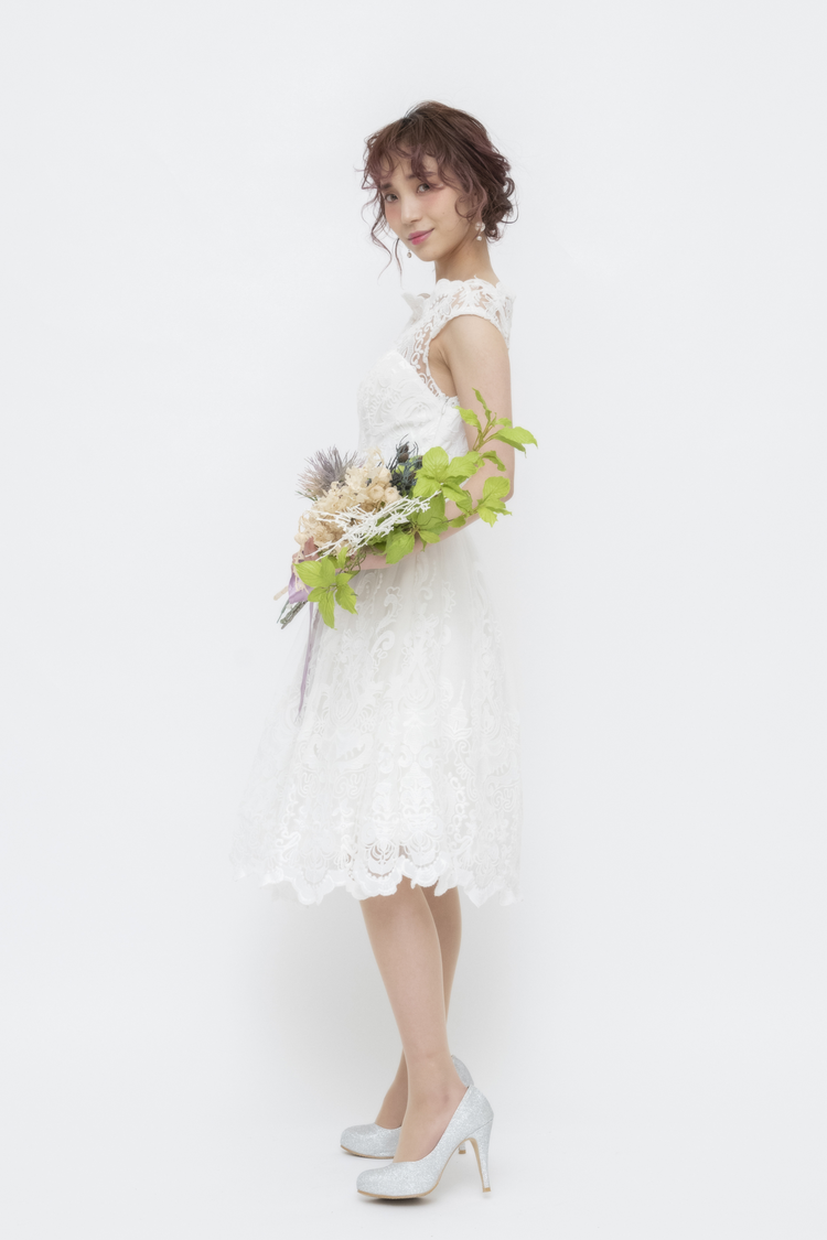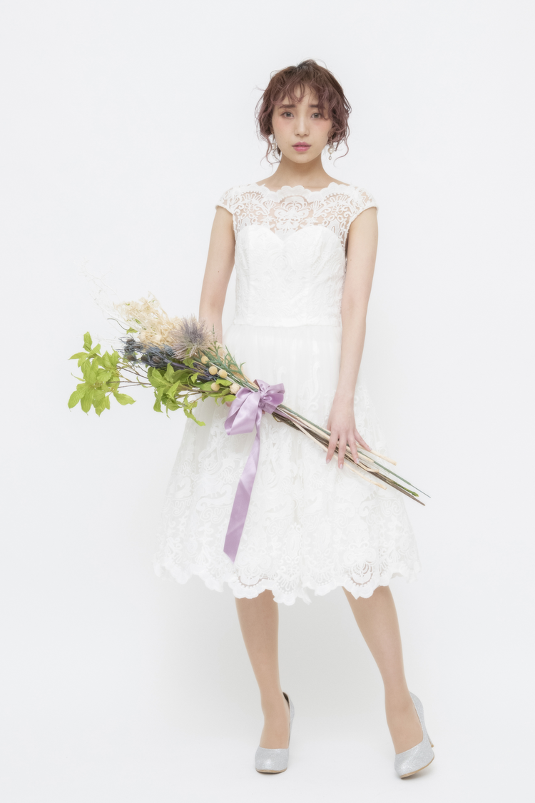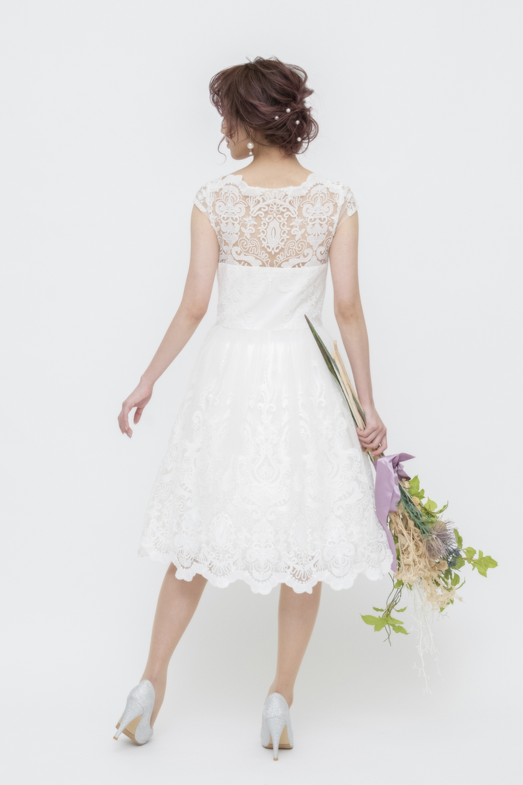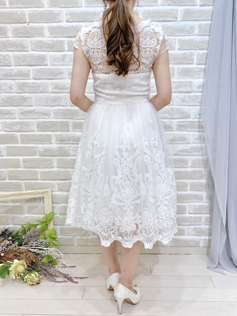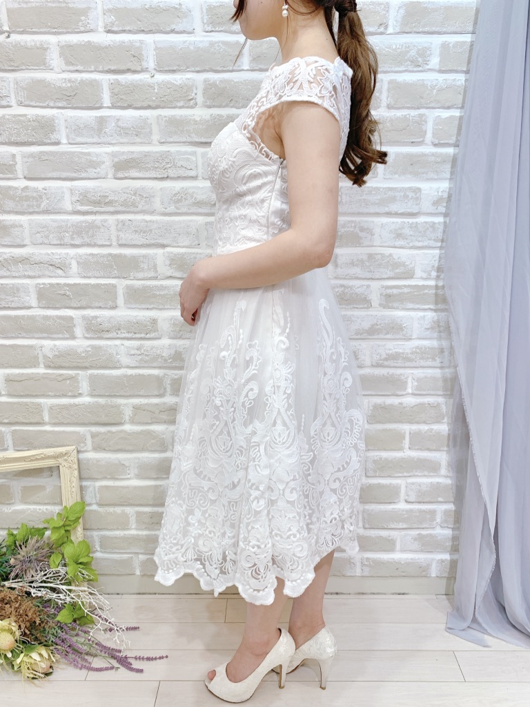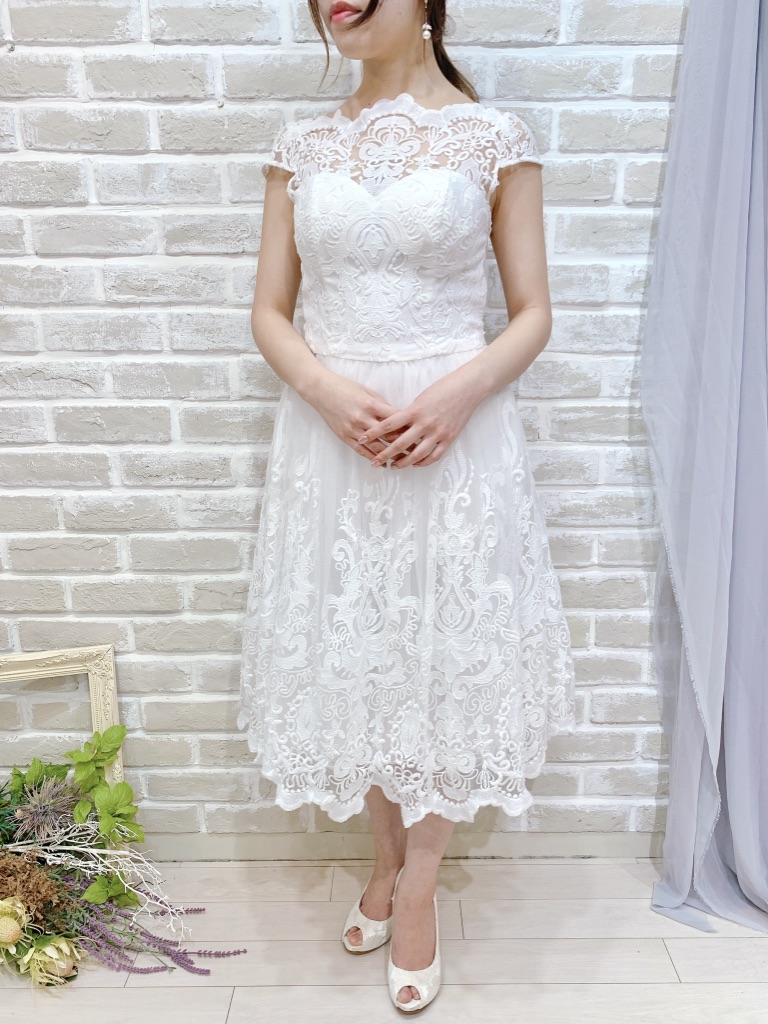 キャップスリーブの露出控えめドレス。ドレス全体に施された大柄の刺繍がとても華やかで主役感満載。ミニ丈やロング丈とはまた違った、大人っぽさと可愛らしさが混在したクラシカルでレディライクな雰囲気を演出してくれるミディアム丈は年々人気上昇中。当店では特にこのタイプが大人気です。ふんわり程よいスカートのボリューム感と年齢層を選ばないデザイン、飲食店等でのカジュアルな2次会にもOKな生地感。新婦様の2次会ドレスやお披露目パーティーなど、最高の日に是非オススメしたいホワイトドレスです。膝下のミディアム丈スカートは、少し高めのヒールでバランスをとるのが美しく見せポイント。