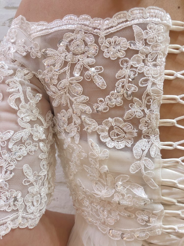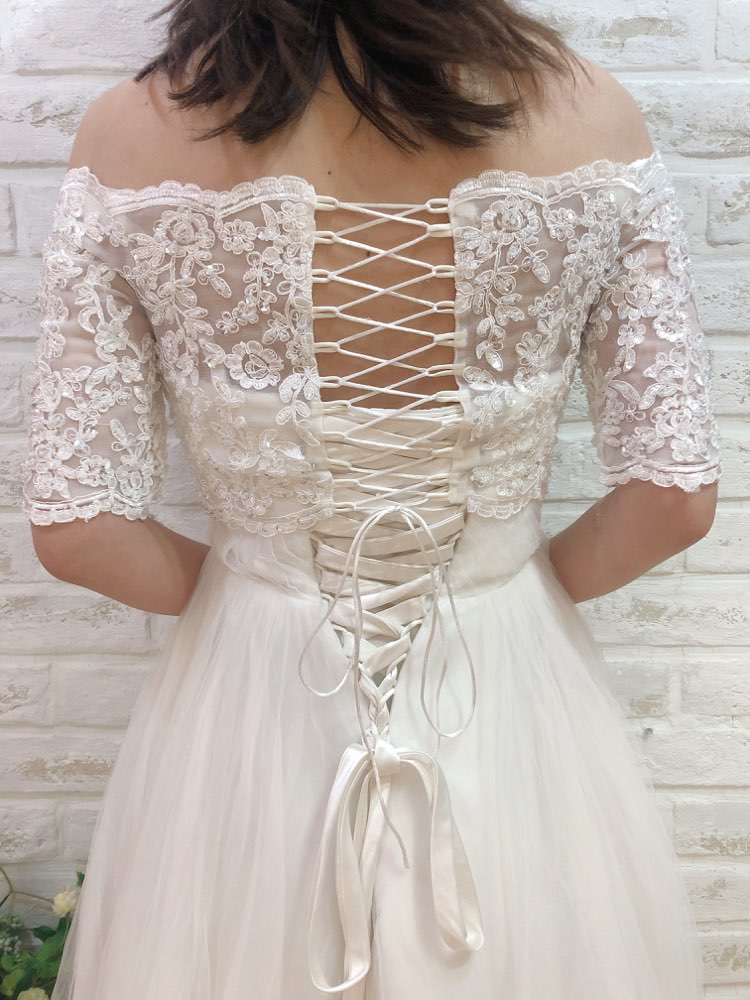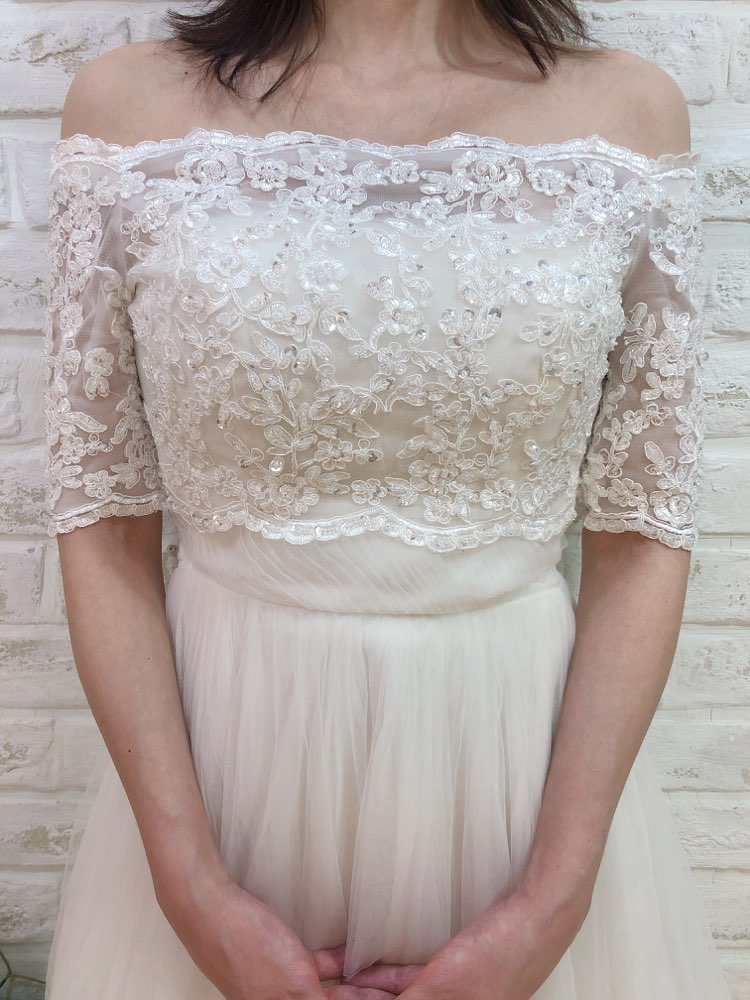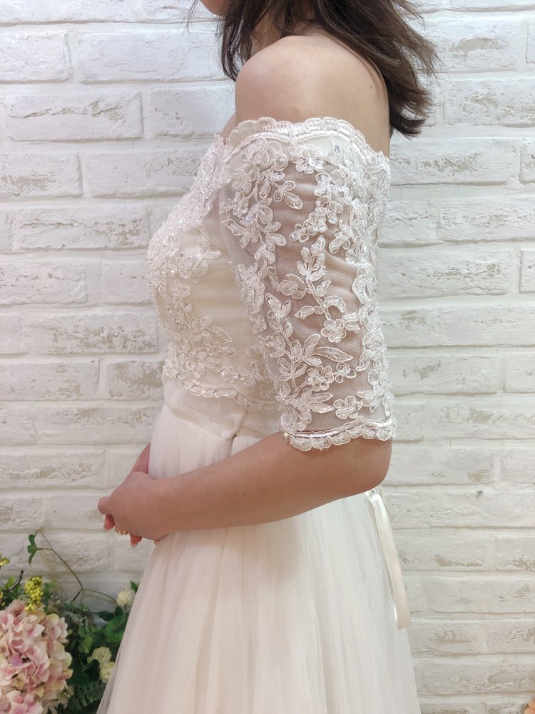 オフホワイトビーズ刺繍付き総レースオフショルダーウェディングボレロ