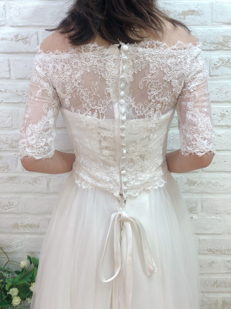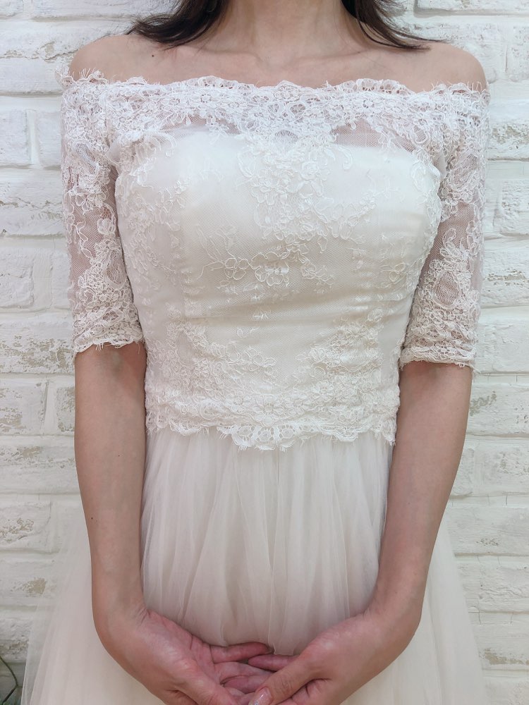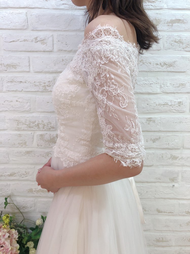 オフホワイトオフショルダーの袖ありファスナーウェディングボレロ