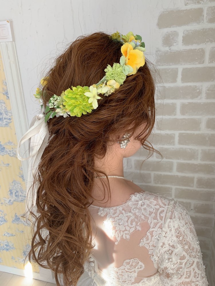 イエロー×グリーンカラーベースの花冠のヘッドアクセサリーです。タンポポのお花がたくさんあしらわれていて、鮮やかな黄色いお花がアクセントになっています。ナチュラル感があり、全体的に柔らかな印象を演出することができます!花嫁様のホワイトカラー、オフホワイトカラーのウェデのイングドレスでもお付けできます。