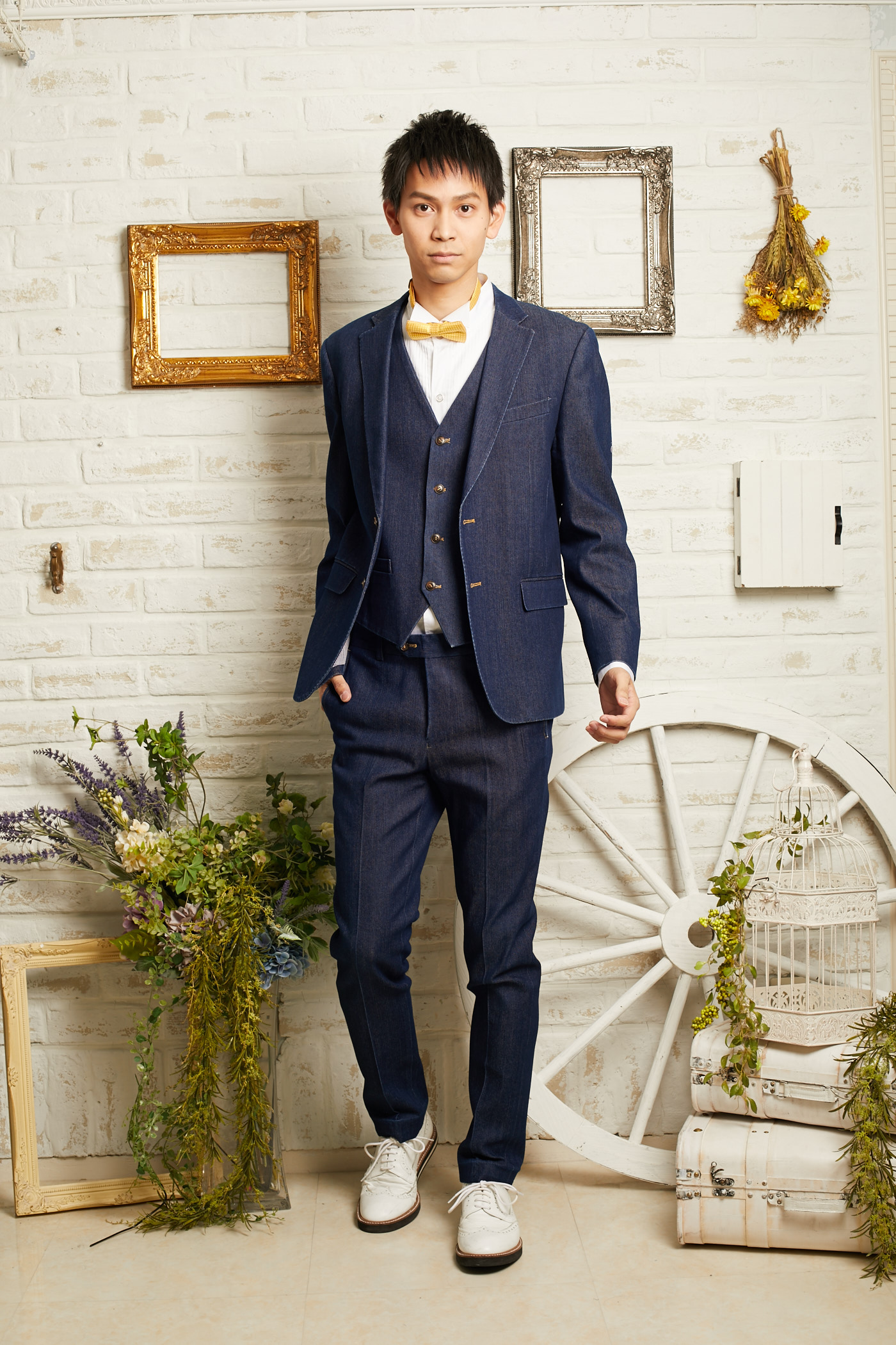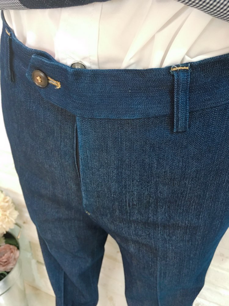 ネイビーデニムのパンツはとってもおしゃれな印象です。同じデニムのセットのジャケットとベストと合わせればより一層華やかな印象になります。前撮り写真撮影にもおすすめです。生地感はデニムですが柔らかいので、長時間着ていても負担は少ないと思います。披露宴のお色直し、二次会、1.5次会、リゾートウェディング、レストランウェディング、パーティー、様々なシーンでご利用頂けます。シャツをチェック柄やストライプ柄、カラーシャツ、小物としてハットなど合わせてもおしゃれなコーディネートになります。
