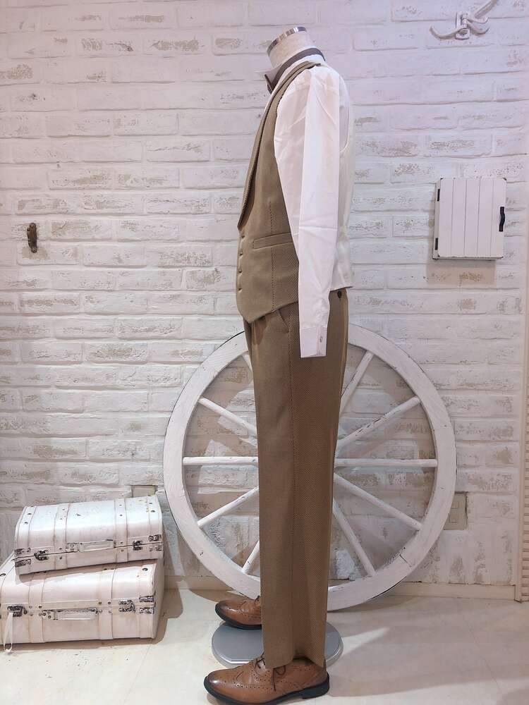 お洒落で優しい印象を与えてくれるブラウン系キャメルカラーベスト。