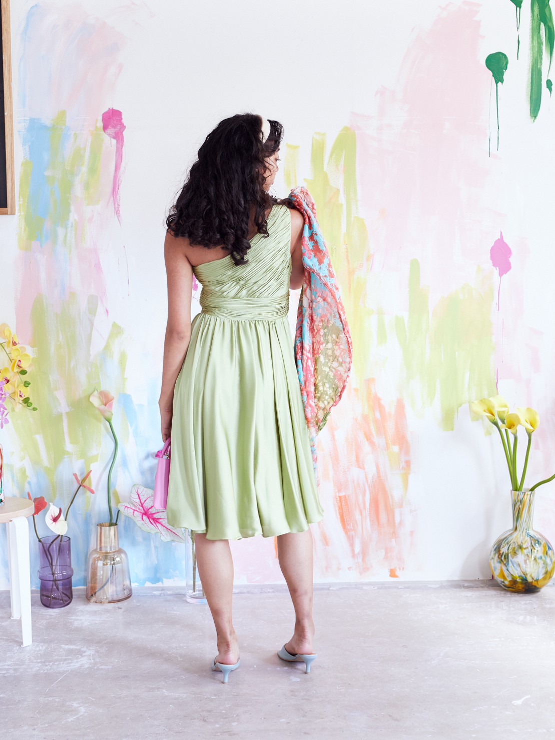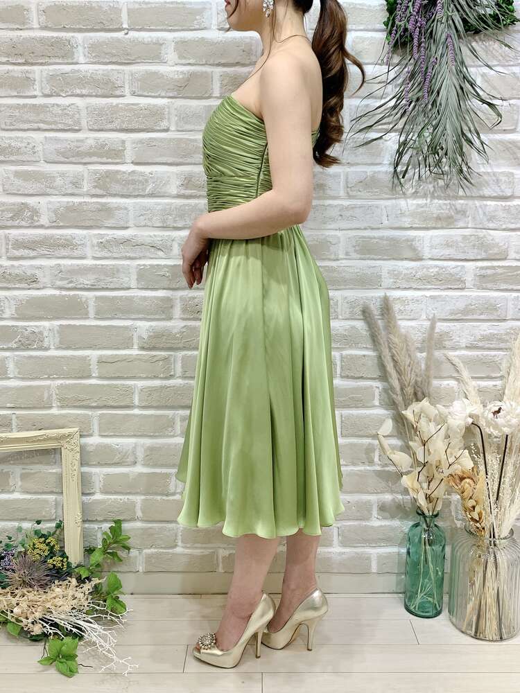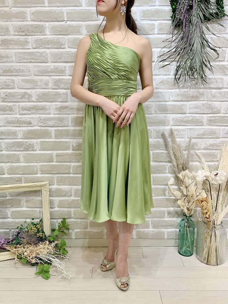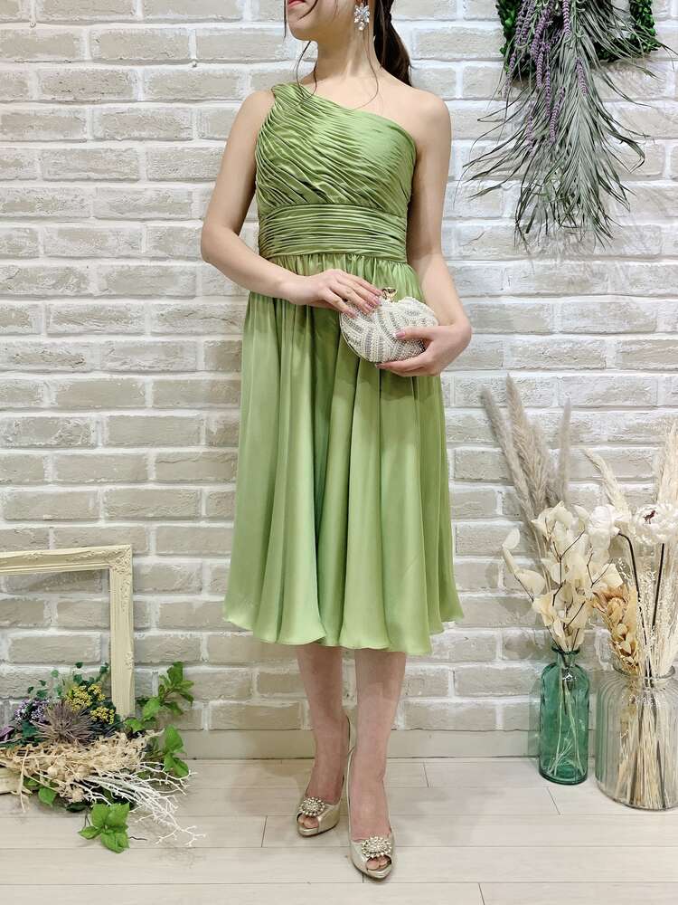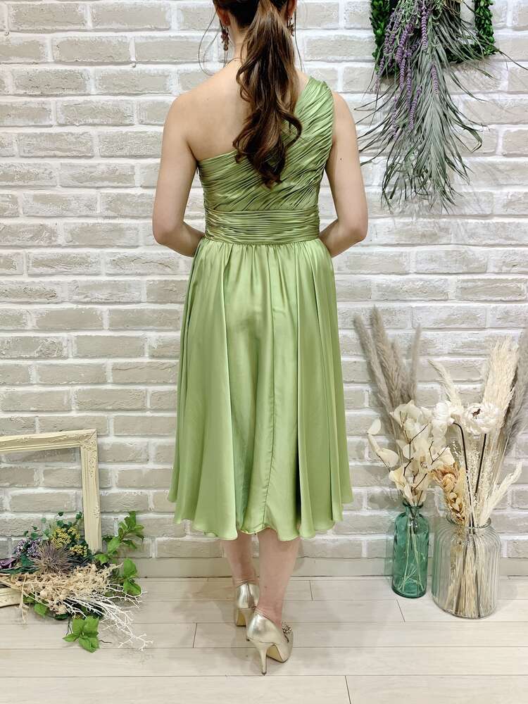 光沢のある優しい色味のグリーンティーカラードレス。シンプルなシルエットですが、ワンショルダーデザインと綺麗な落ち感のあるスカートが大人っぽさ、上品さ、華やかさをプラスしてくれます。他と被らないカラーも特徴的で、目を惹く事間違いなしです。こちらのドレスのイメージは、『上品』『清楚』。丈感も安心のひざ下丈なので、結婚式のゲスト用としてはもちろん、羽織を羽織ってご親族同士の顔合わせなど柔らかい印象で臨みたいシーンにもおすすめです。スッキリした肩周りで羽織を選ばず、ボレロで柔らかく、ストールでエレガントに、ジャケットだと落ち着いた雰囲気に。シーンに合わせて様々なコーディネートが可能なので、幅広い年齢層の方に着用いただけます。華やかすぎず、上品なイメージにピッタリな1着です。