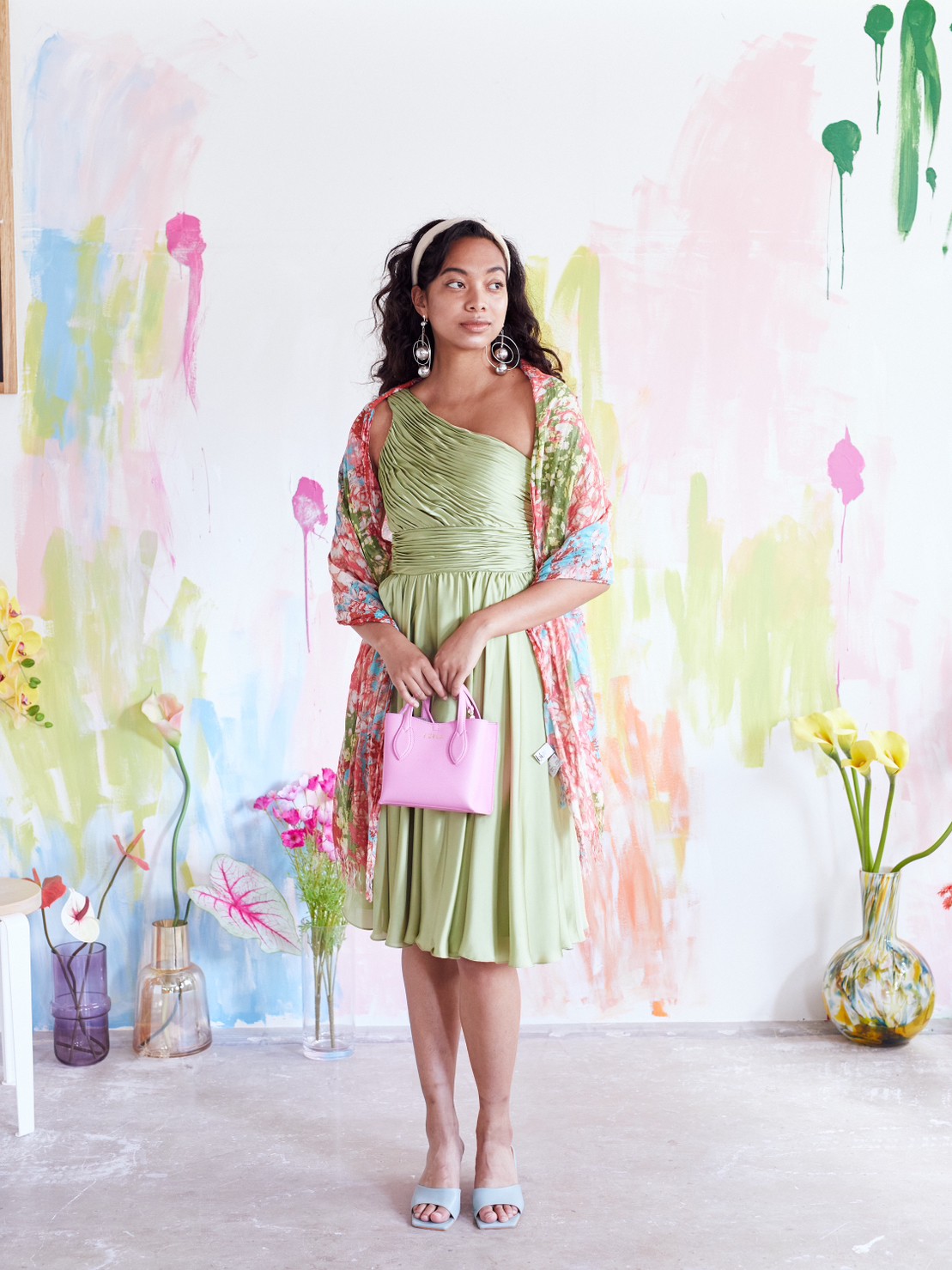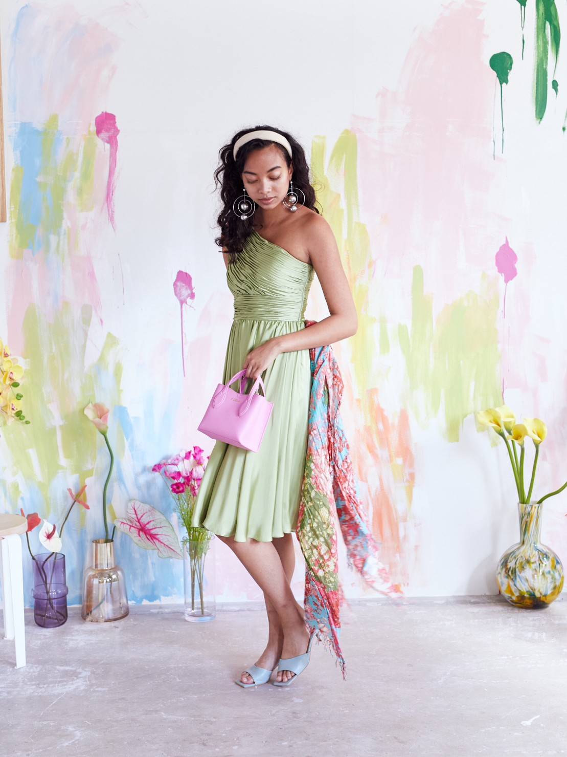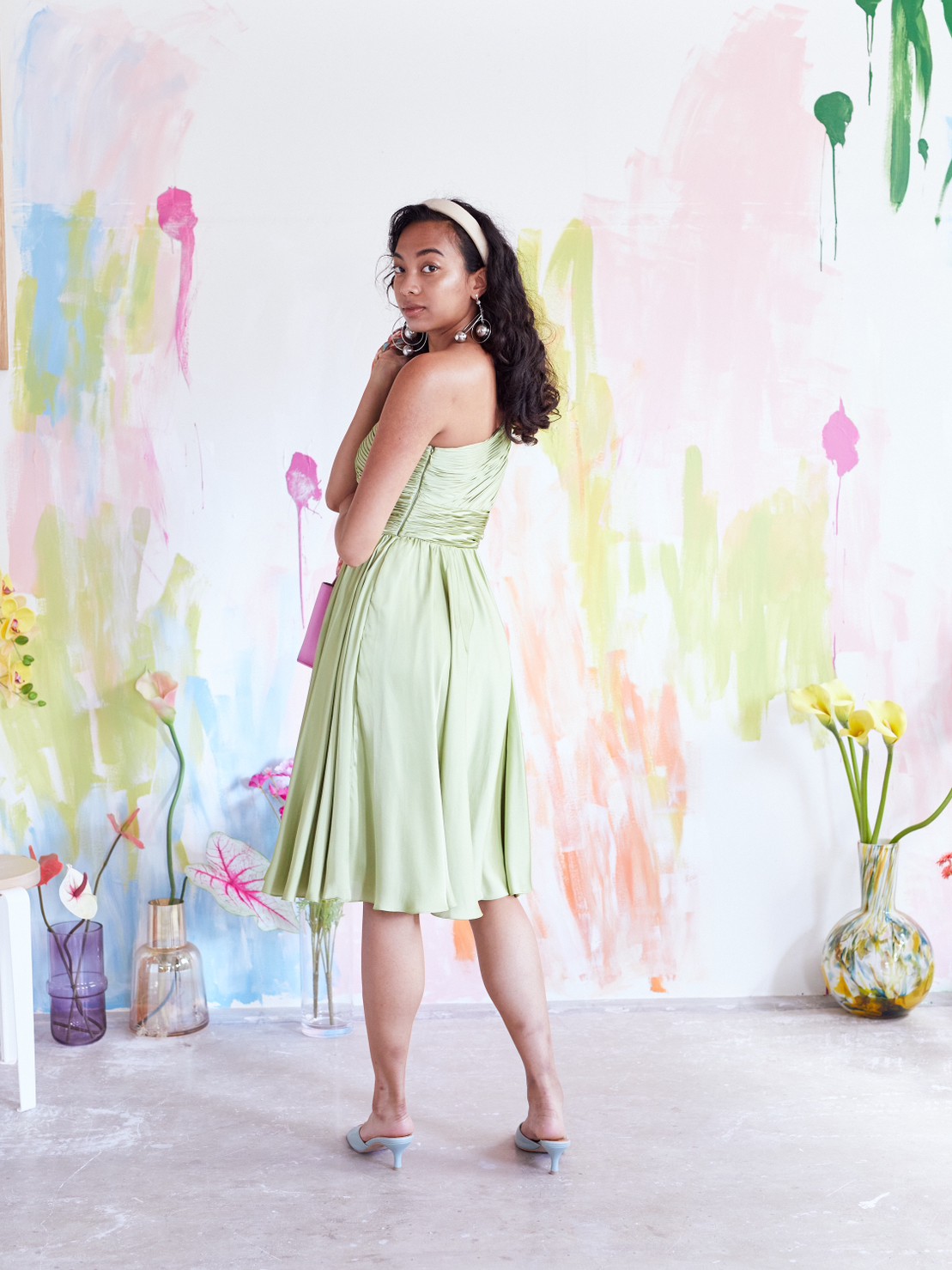 光沢のある優しい色味のグリーンティーカラードレス。シンプルなシルエットですが、ワンショルダーデザインと綺麗な落ち感のあるスカートが大人っぽさ、上品さ、華やかさをプラスしてくれます。他と被らないカラーも特徴的で、目を惹く事間違いなしです。こちらのドレスのイメージは、『上品』『清楚』。丈感も安心のひざ下丈なので、結婚式のゲスト用としてはもちろん、羽織を羽織ってご親族同士の顔合わせなど柔らかい印象で臨みたいシーンにもおすすめです。スッキリした肩周りで羽織を選ばず、ボレロで柔らかく、ストールでエレガントに、ジャケットだと落ち着いた雰囲気に。シーンに合わせて様々なコーディネートが可能なので、幅広い年齢層の方に着用いただけます。華やかすぎず、上品なイメージにピッタリな1着です。