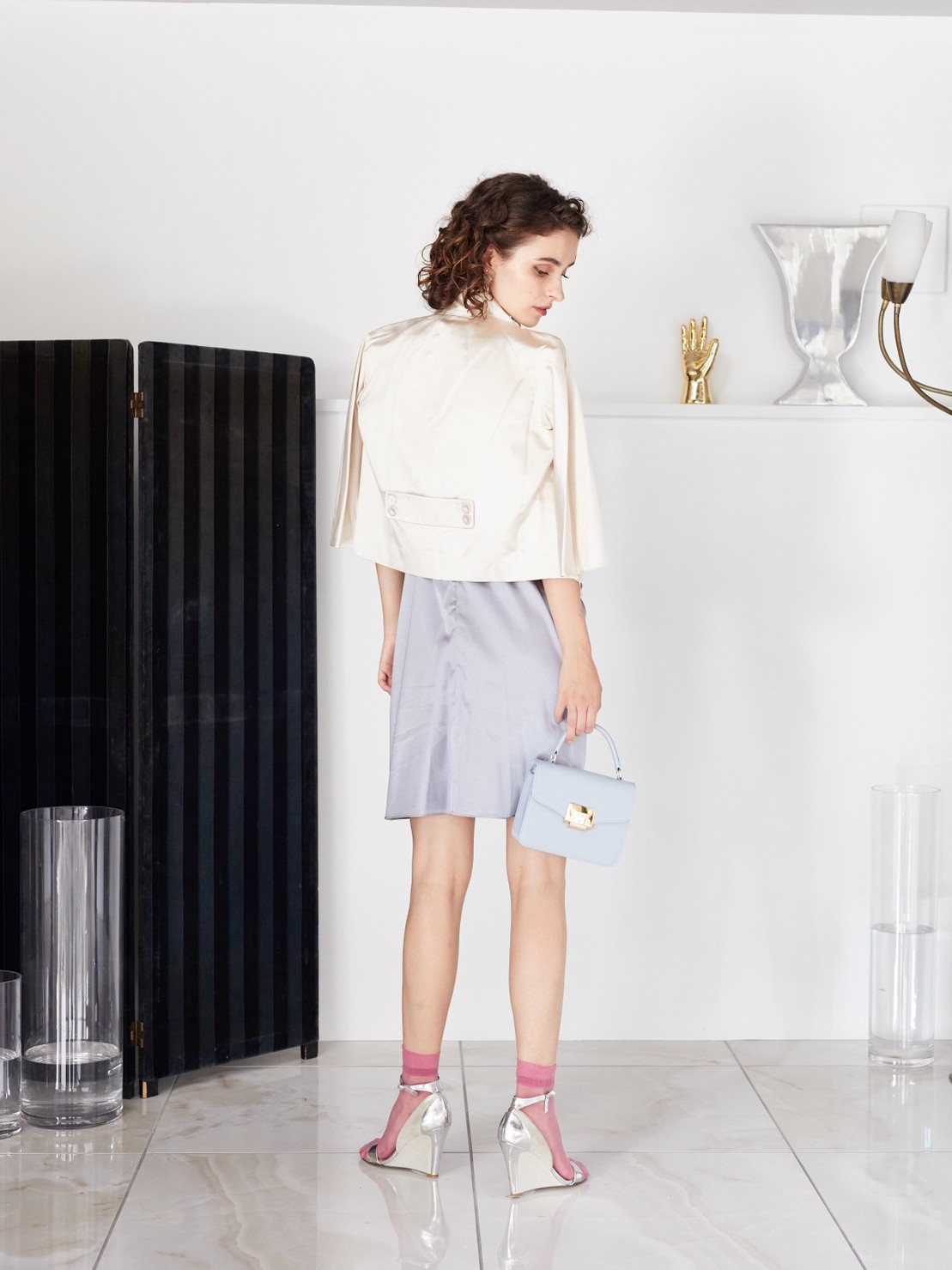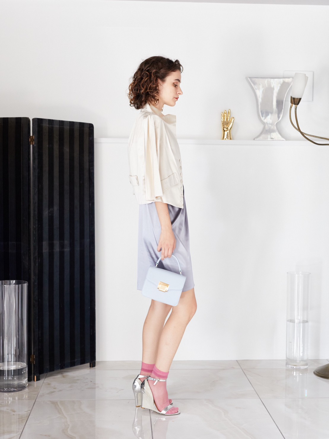エレガントなデザインがセレブにも人気のadrianna papell。オーバルネックにアメリカンスリーブデザイン。胸元にかけて5cm程度のスリットが入ったちょっぴりセクシーなドレス。光沢のあるシルバーカラーで華やかさアップ。着用するとタイトなシルエットですがウエストの切替下はラップスカートになっており、ヒップから太ももにかけては緩やかなフィット感。その為立ち座りの際にも余裕があり気になりません。カラー・デザイン・シルエット、全体的に大人な印象のこちらのドレス。20代後半~の方にかっこ良く着ていただける1着。開きの少ないネックラインですので、ボレロではなくストール・ジャケットでのコーディネートがおすすめです。華やかなパーティーシーンには1枚でかっこよく、少し艶やかに行かれてみてはいかがでしょうか。