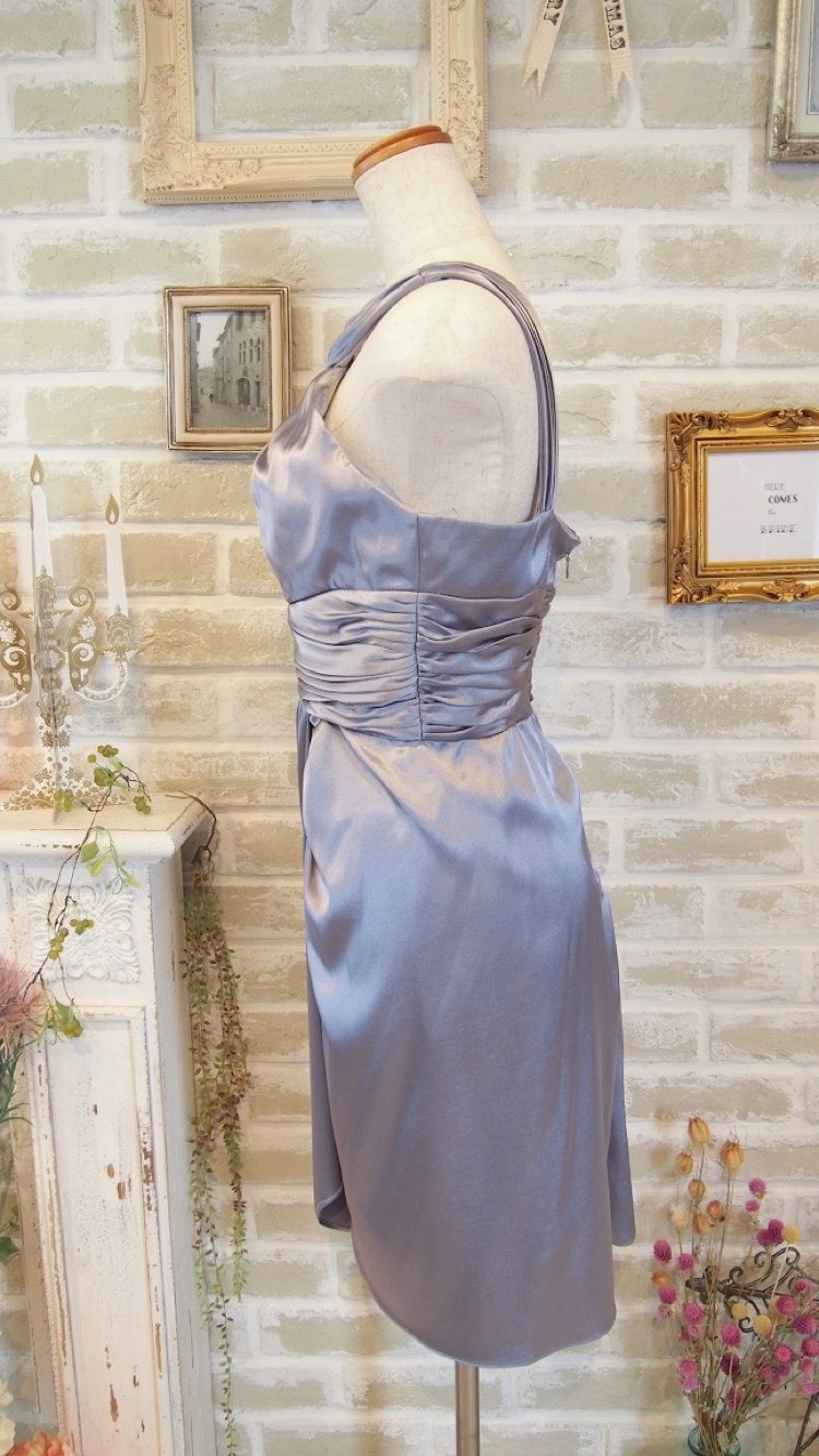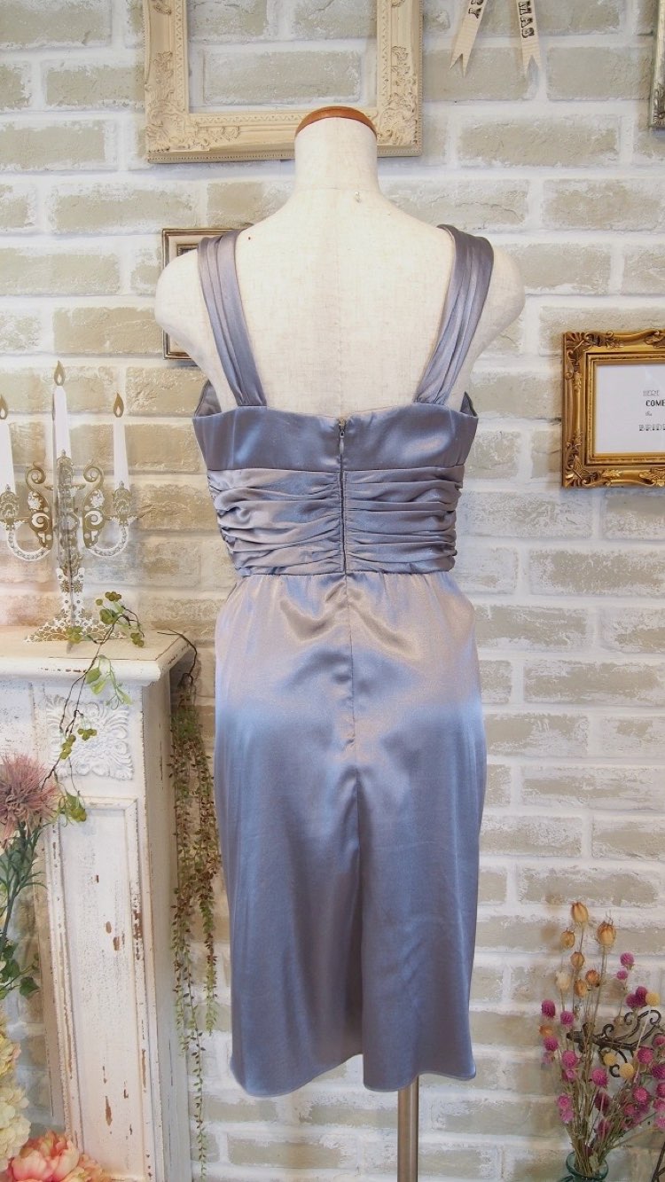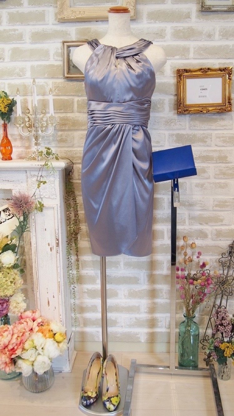 エレガントなデザインがセレブにも人気のadrianna papell。オーバルネックにアメリカンスリーブデザイン。胸元にかけて5cm程度のスリットが入ったちょっぴりセクシーなドレス。光沢のあるシルバーカラーで華やかさアップ。着用するとタイトなシルエットですがウエストの切替下はラップスカートになっており、ヒップから太ももにかけては緩やかなフィット感。その為立ち座りの際にも余裕があり気になりません。カラー・デザイン・シルエット、全体的に大人な印象のこちらのドレス。20代後半~の方にかっこ良く着ていただける1着。開きの少ないネックラインですので、ボレロではなくストール・ジャケットでのコーディネートがおすすめです。華やかなパーティーシーンには1枚でかっこよく、少し艶やかに行かれてみてはいかがでしょうか。