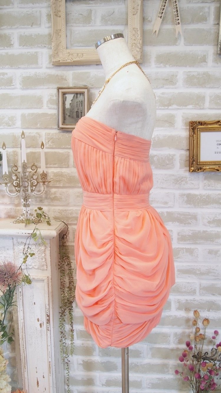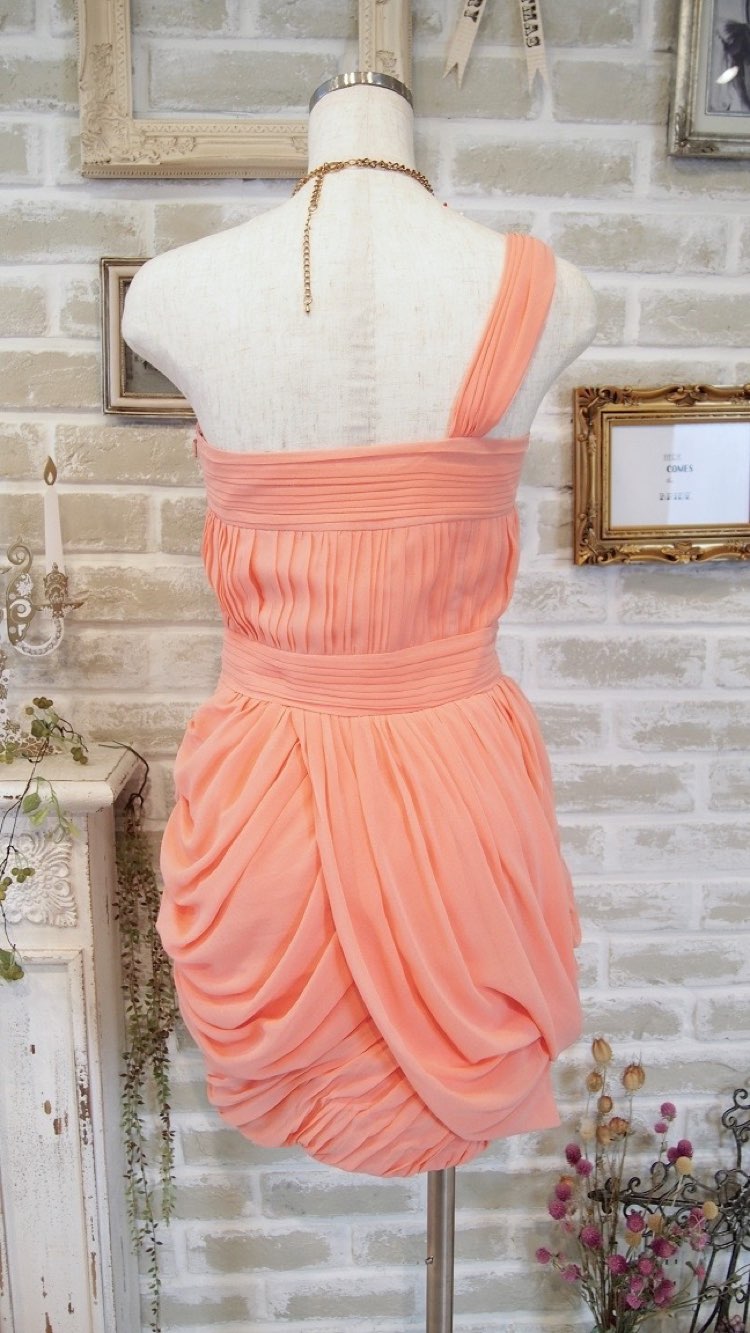 たっぷりドレープの入った、キュートな印象のピーチピンクのシフォン生地。ミニ丈のタイトなシルエットで、大人っぽさと可愛らしさの両方が揃うパーティードレスです。思いっきりおしゃれを楽しみたい謝恩会や、女子会などのパーティーに1枚で着用するのがおすすめ。羽織を羽織ると、ワンショルダーのかっこよさが抑えられ柔らかい雰囲気にも見せることができ、結婚式参列にも使えます。小柄な方向きの、比較的短めの丈感となっております。また、ドレープのおかげで直接ボディラインが響くことがないのも嬉しいポイント。春夏に着たい、軽やかな質感と明るいカラーです。