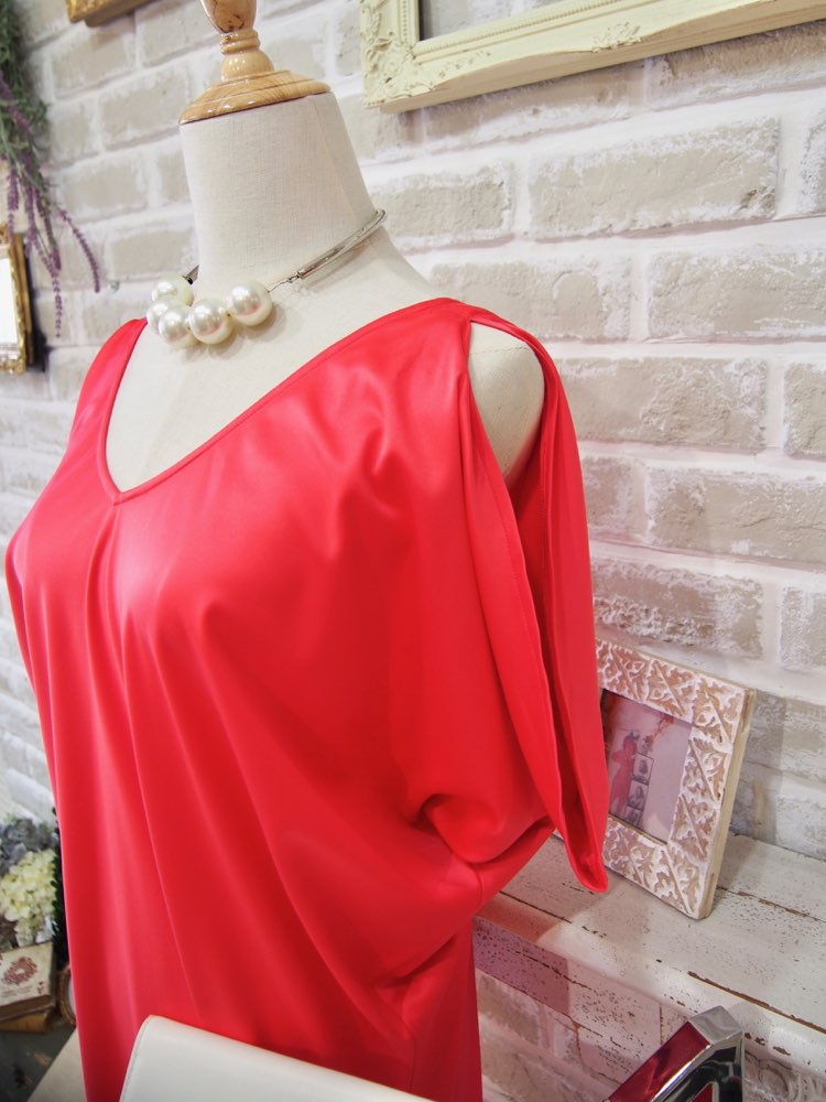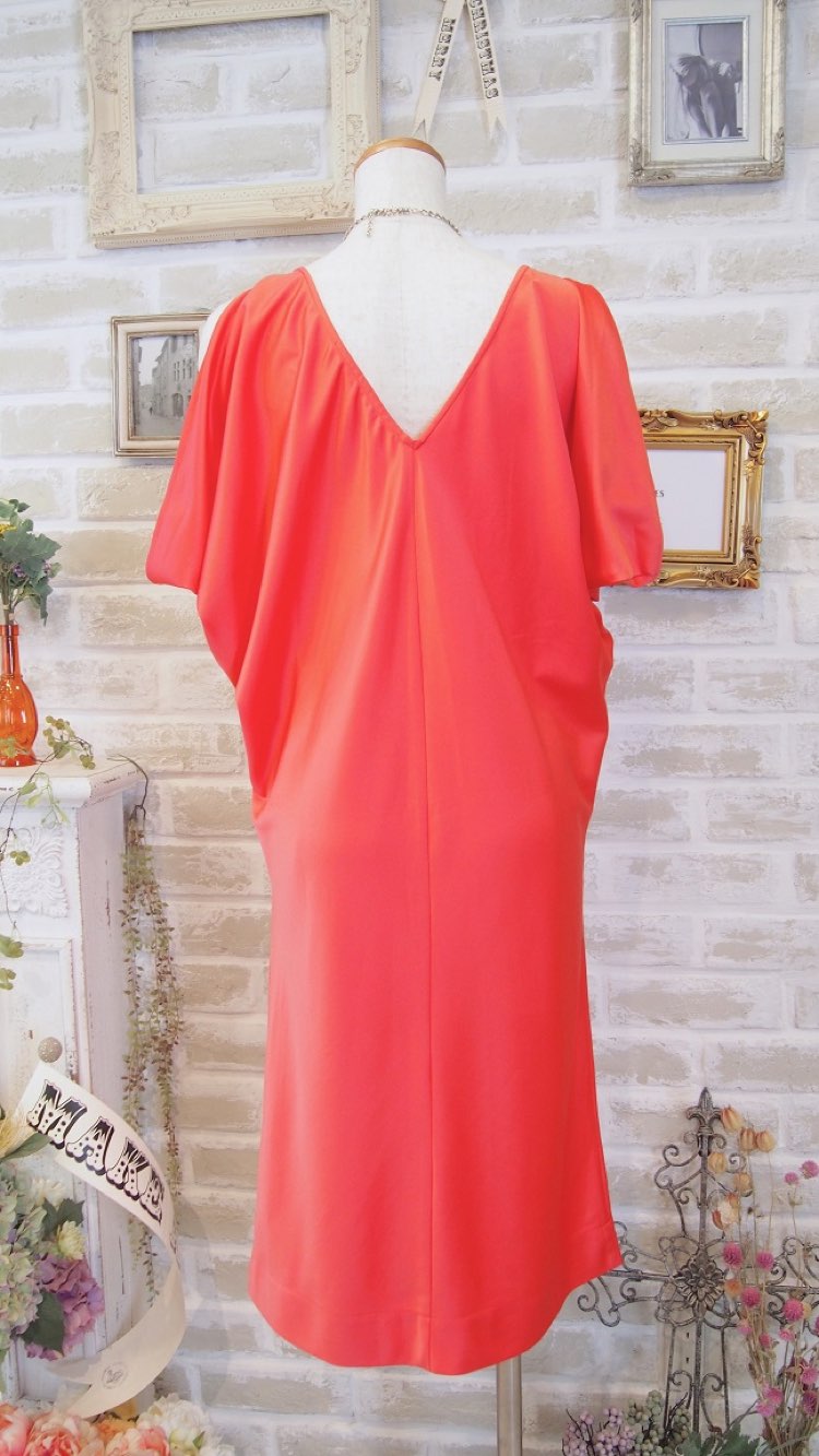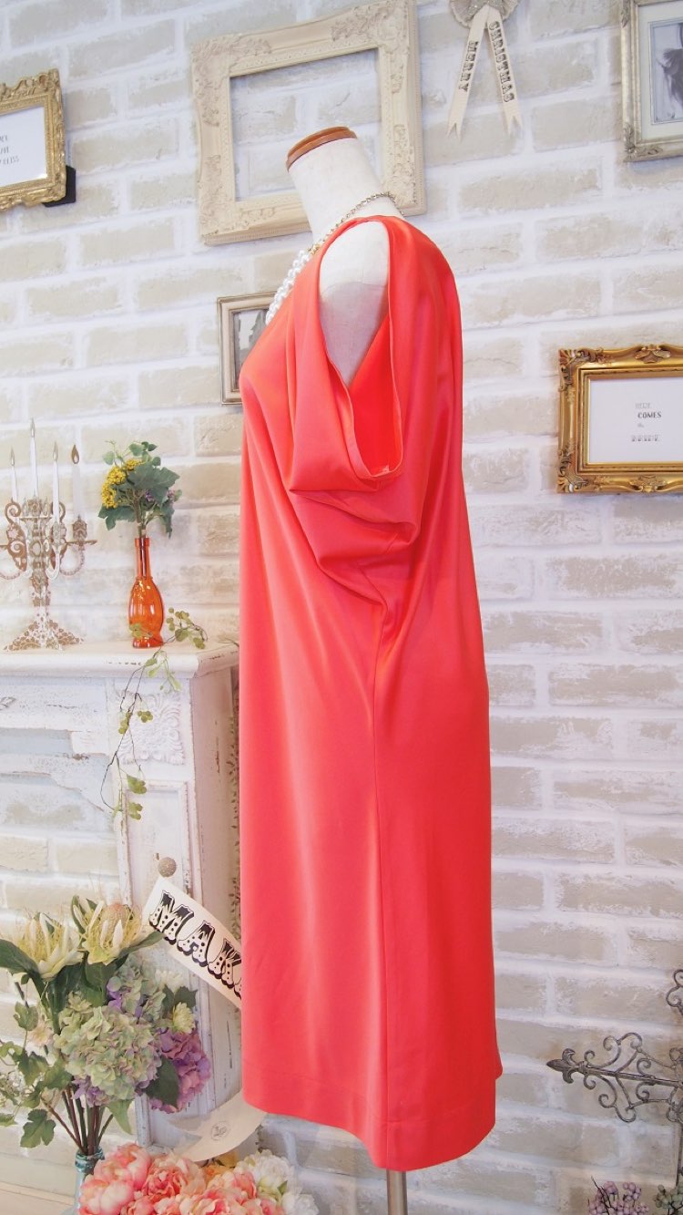 脇の部分がドルマンシルエットになった個性的なデザイン。ツヤのあるコーラル寄りのピンクカラーで、つるっとして肌触りが良い素材感です。切替もなくストンと落ちるデザインは個性的でありながら、大人な雰囲気も出してくれる1着です。比較的ルーズな着用感のドレスなので、カチッとした場面より、暑い季節のガーデンパーティーなどカジュアルなシーンにぴったりです。丈は長めで着用いただける年齢層も幅広く、『人とかぶりたくない』『少し個性的なドレスを着たい』といった方にぜひ挑戦していただきたいドレスです。こちらのドレスは羽織なしで1枚で着用いただくのが1番綺麗に見えますが、必要な場合は、ストールをさらっと肩から掛けていただく程度がおすすめです。