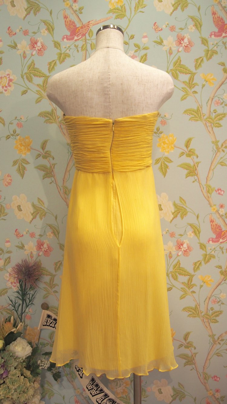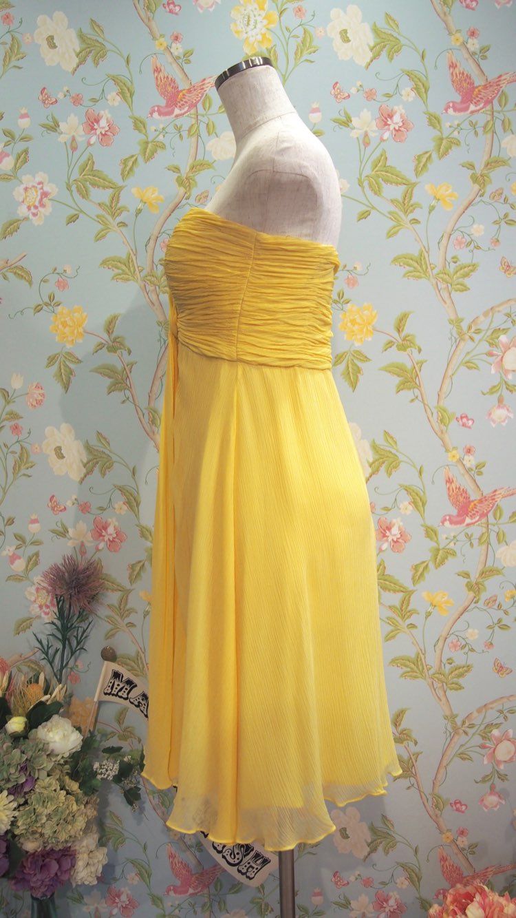 花嫁やブライズメイドなどブライダルシーンのドレスで有名なdonna morgan。柔らかいパステルイエローベアドレス。王道でシンプルなデザインですが、表地がシルク100%で柔らかく女性らしい印象を与えてくれるドレスです。さらっと涼しい着心地のシルク素材は、春夏におすすめです。ガーデンパーティーだと1枚で明るく、結婚式のゲストなどの場合はボレロを羽織って控えめに、それぞれのシーンに合ったコーディネートを楽しめます。比較的丈が長めのデザインですので、年齢層も幅広く、シンプルかつナチュラルな雰囲気で着用いただけます。柔らかい色味のドレスは、品よく華やかな印象に。
