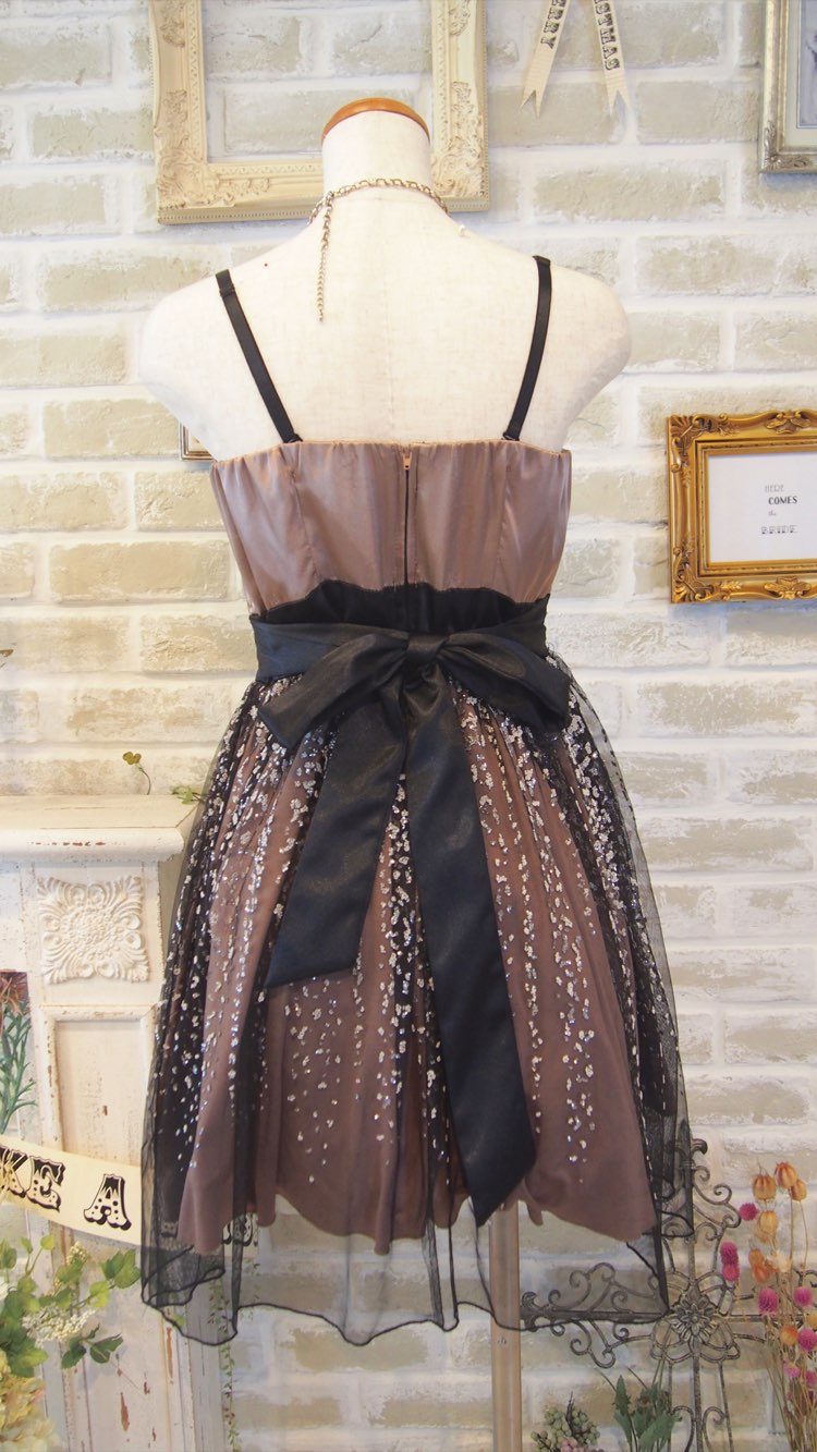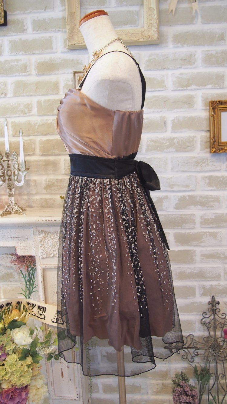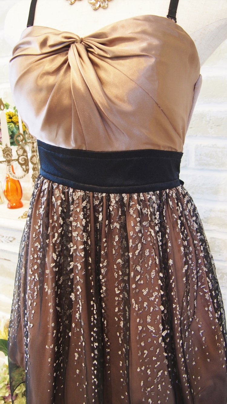 落ち着いたモカブラウンの光沢生地にブラックのリボンが全体を引き締め、グリッターと粒パールのレオパード柄のチュールのスカートが華やかさをプラスしてくれるフレアスカートドレス。スカート内側にはパニエのようにチュールが入っているので、ふんわりしたボリューム感に。また、長さの調節可能な肩紐がついており、着用中も下がってくる心配がなく安心感のあるドレスです。チュールの内側から膝が覗くミニ丈で、10~20代の結婚式ゲストドレスや謝恩会にもおすすめです。大人可愛いフレアスカートドレスをお探しの方にぴったりです。