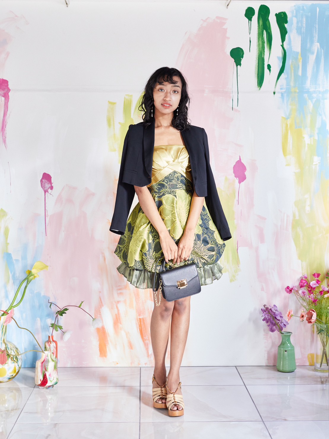 オリエンタルなムードが漂う花柄ジャガードファブリックが存在感のある、ミニ丈バルーンドレス。イエローゴールドとブラックの落ち着いた色味をMIXした、インパクトのあるデザインとなっています。パッと目を惹く大柄のドレスに挑戦できるのもレンタルならでは。毎年謝恩会やパーティーで人気のタイプです。小物の色味を暗めにすると、クールでかっこいいイメージに。反対に明るい色の小物を合わせると、少しキュートなイメージに。コーディネート次第でドレスの印象が変わるので、TPOやキャラクターに合わせたコーディネートを。