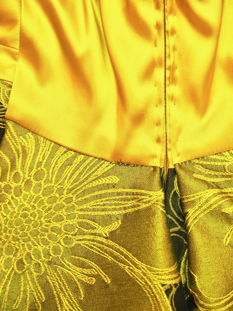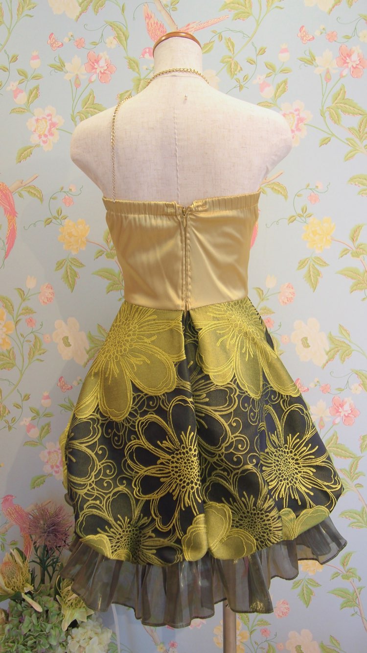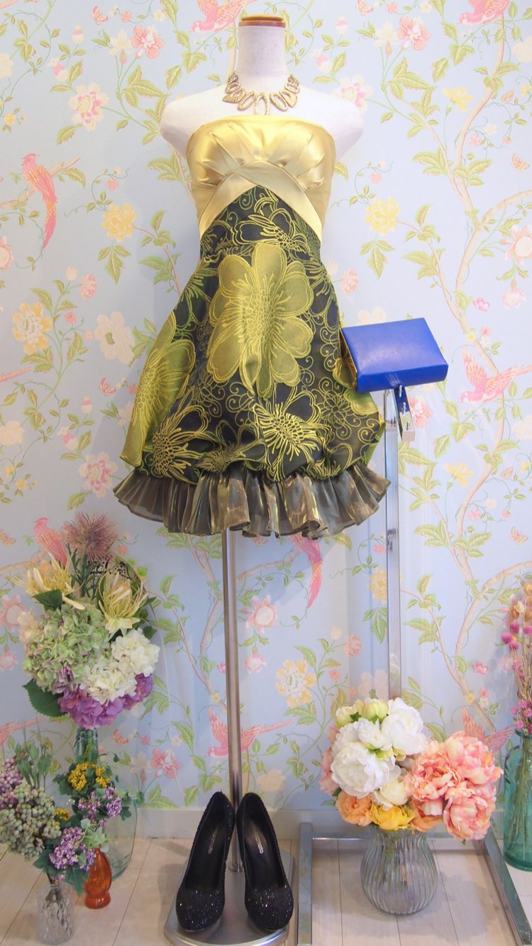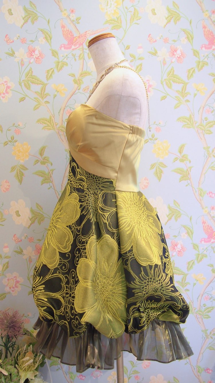 オリエンタルなムードが漂う花柄ジャガードファブリックが存在感のある、ミニ丈バルーンドレス。イエローゴールドとブラックの落ち着いた色味をMIXした、インパクトのあるデザインとなっています。パッと目を惹く大柄のドレスに挑戦できるのもレンタルならでは。毎年謝恩会やパーティーで人気のタイプです。小物の色味を暗めにすると、クールでかっこいいイメージに。反対に明るい色の小物を合わせると、少しキュートなイメージに。コーディネート次第でドレスの印象が変わるので、TPOやキャラクターに合わせたコーディネートを。