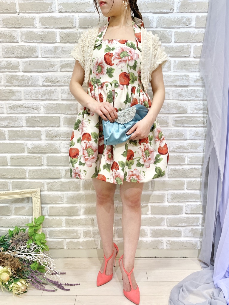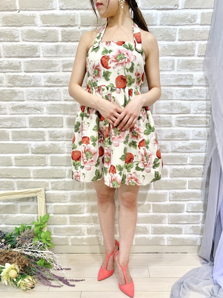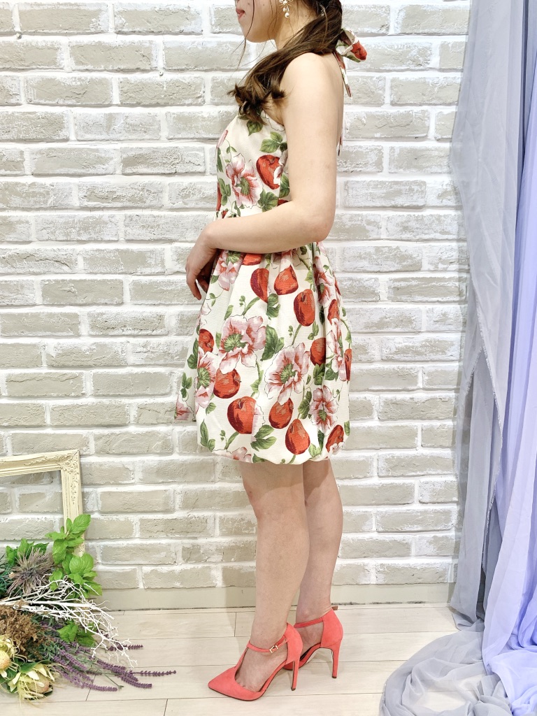 柔らかいカラーリングのフルーツプリントにホルターネックのバルーンスカートドレス。普段着を少しアップデートしたようなデザインで、春夏のガーデンパーティーや女子会などカジュアルなドレスアップスタイルで臨みたいシーンなど、10代や20代の方の利用にぴったりです。パーティーシーンでは1枚でさらっと着てキュートなコーディネートを、羽織りたい場合はボレロとも相性◎です。小物にも思い切って明るい色を入れると、より色味が引き立ちます。アクセサリーはポイントを絞って。購入では手を出しにくい華やかワンピース、レンタルでぜひ挑戦されてみては。