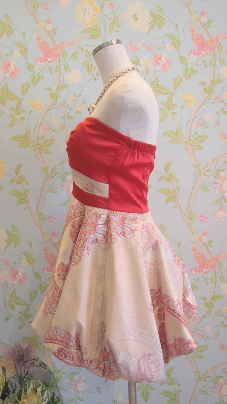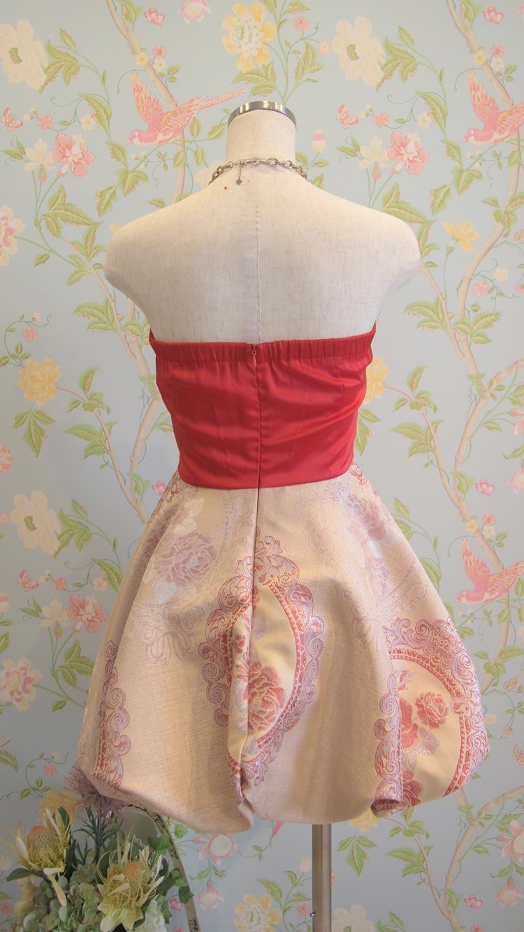 ロココ調の大きなバラのジャガードファブリックが存在感のある、ミニ丈バルーンドレス。落ち付いた淡いピンクをベースに、トップは赤で引き締めたインパクトのあるデザインとなっています。パッと目を惹く大柄のドレスに挑戦できるのもレンタルならでは。毎年謝恩会やパーティーで人気のタイプです。小物の色味を抑えると、品がありフェミニンな雰囲気に。反対に思い切って明るい色や濃い色の小物を合わせると、より色味が引き立ちます。コーディネート次第でドレスのイメージが変わるので、TPOやキャラクターに合わせたコーディネートを。