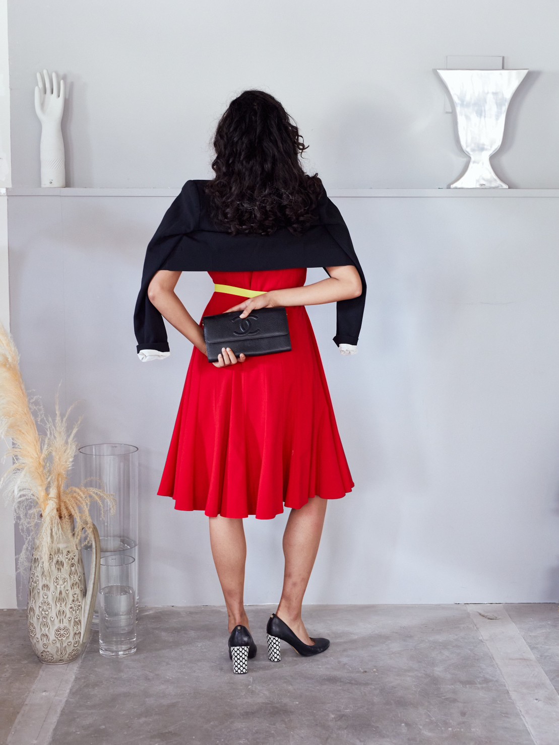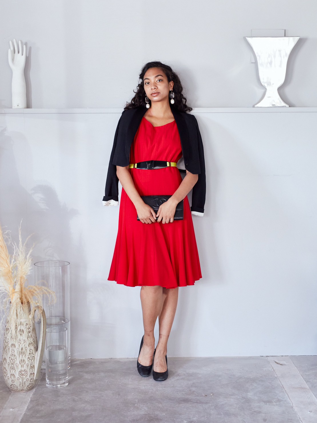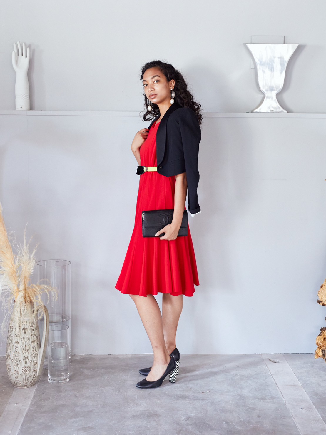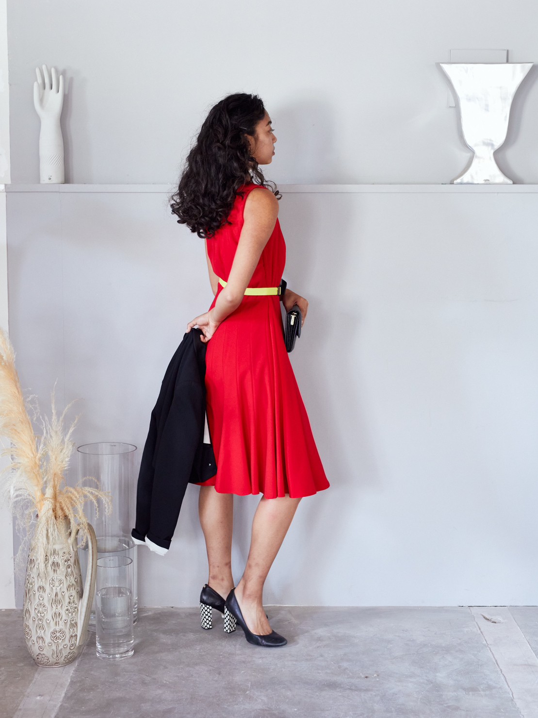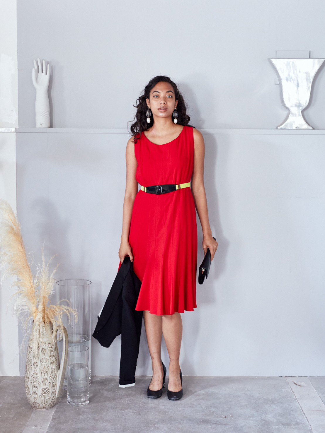 ミディアム丈のフィット&フレアノースリーブドレス。クラシカルなシルエットが上品で女性らしい印象。長めの丈のドレスは年々人気が上昇中。当店にも上品な丈感のドレスが続々入荷中。ウエストから広がるAラインが程よい華やかさを演出してくれるので、結婚式のゲストドレス・パーティー・食事会など様々なシーンで活躍してくれるドレスです。可愛いだけじゃなく大人っぽさ・女性らしさも欲しい、そんな方におすすめです。合わせる小物次第でコーディネートも自由自在。ぜひ自分好みのテイストで着こなしてみてください。