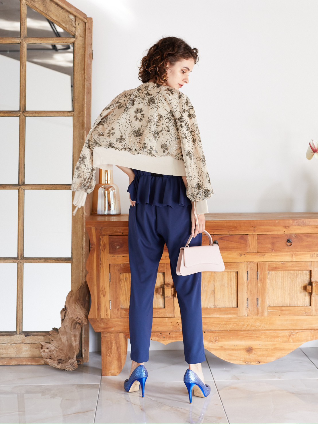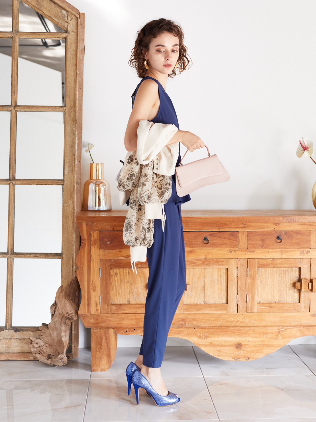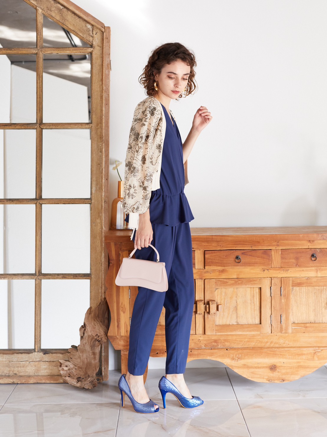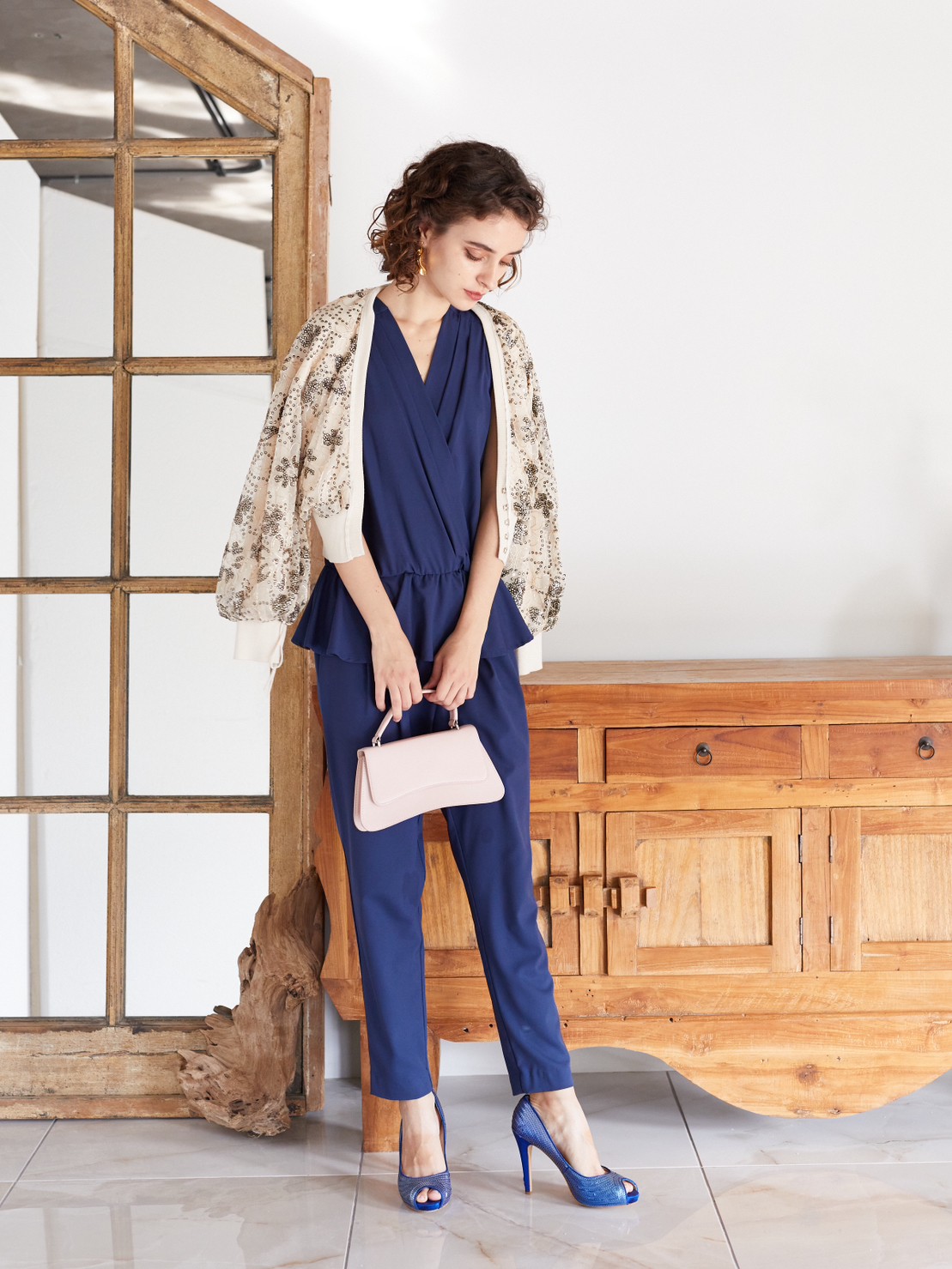 ネイビーシースルーバックぺプラムジャンプスーツ