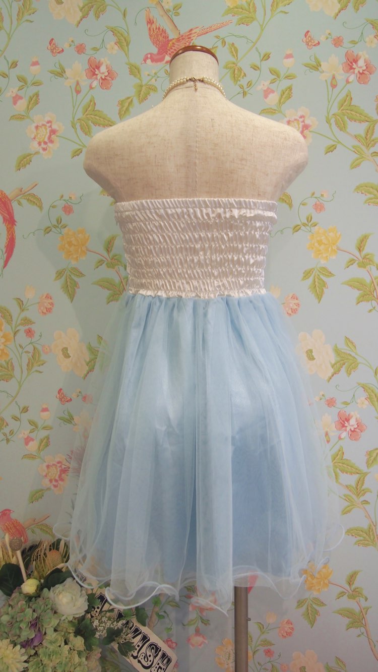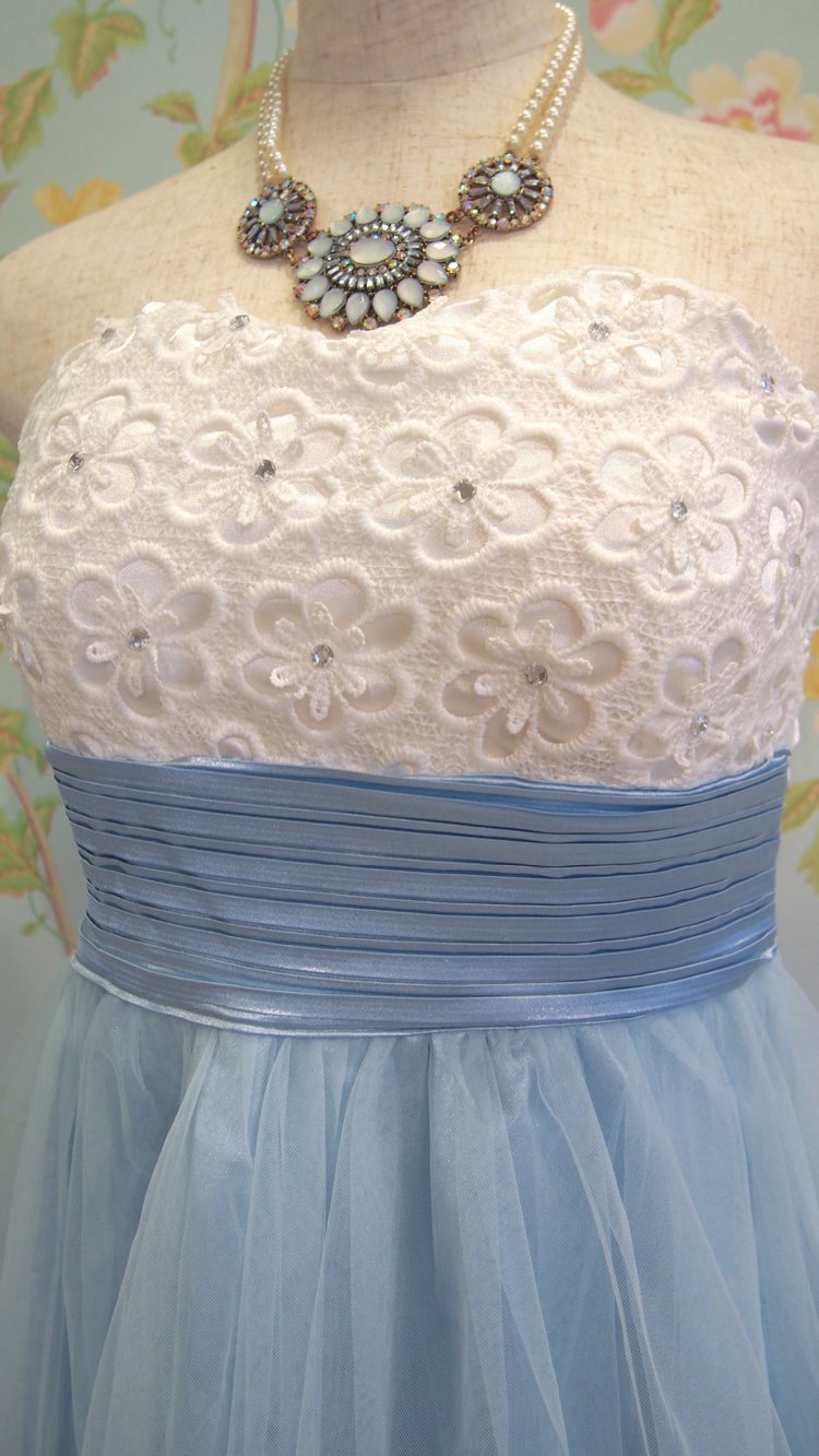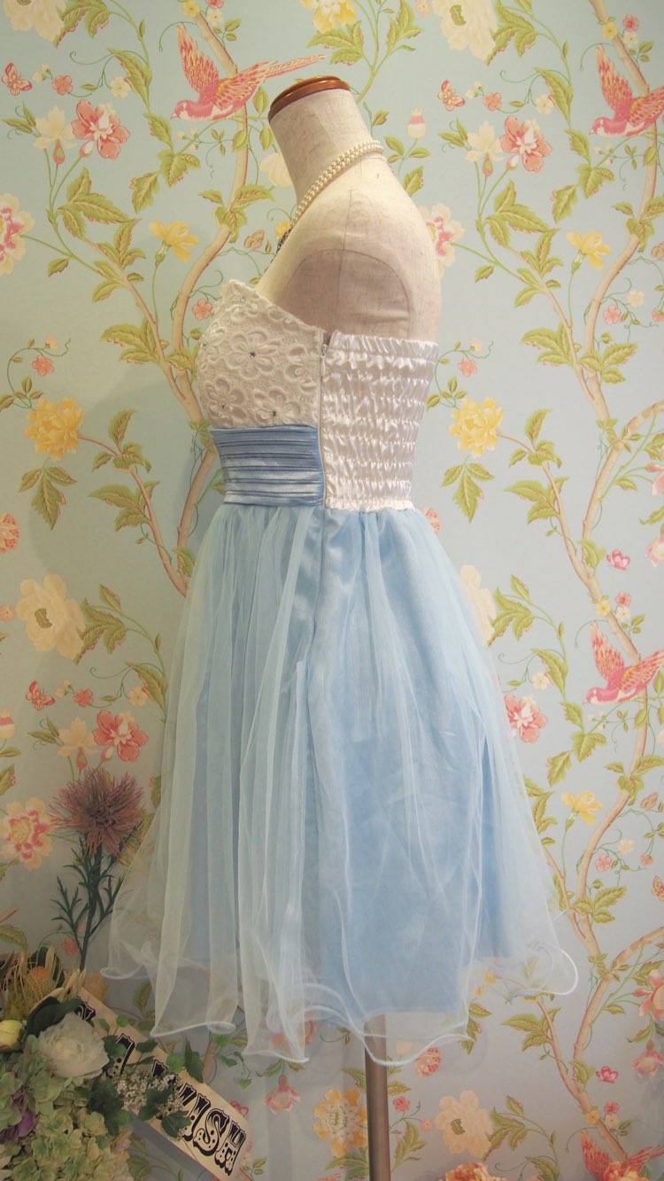 ホワイトとパステルグリーンのバイカラーふんわり柔らかベアトップドレス。チュールスカートが甘くキュートな印象。優しいカラーで派手になりすぎることがなく、若々しい可愛らしさ満点のデザイン。新婦様の2次会パーティードレスとしてはもちろん、謝恩会にもおすすめです。また、胸の下で切替の入ったハイウエストのシルエットにミニ丈のフレアスカートは脚長効果も期待でき、小柄な方にぴったり。スイートなフェミニンスタイルがお好きな10~20代の方に着用していただきたい1着です。生地が薄手のライトカラードレスですので色が響かないベージュ系のインナーをご準備いただくと安心です。