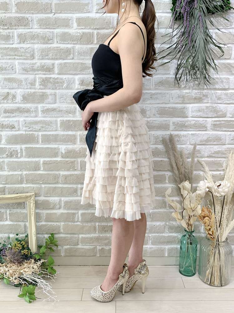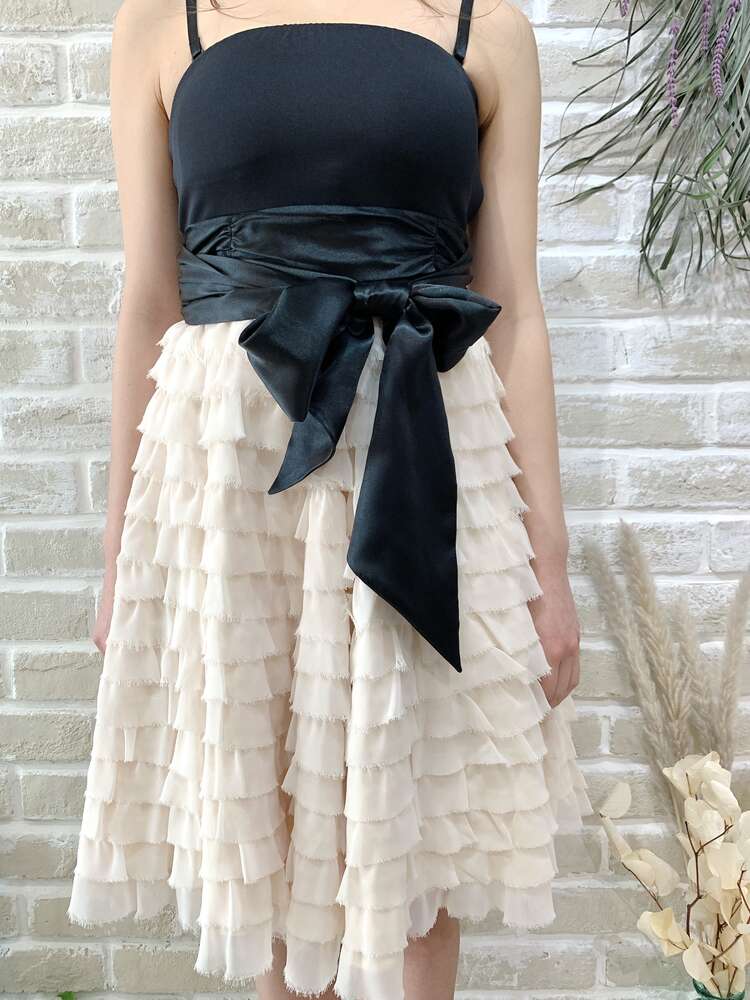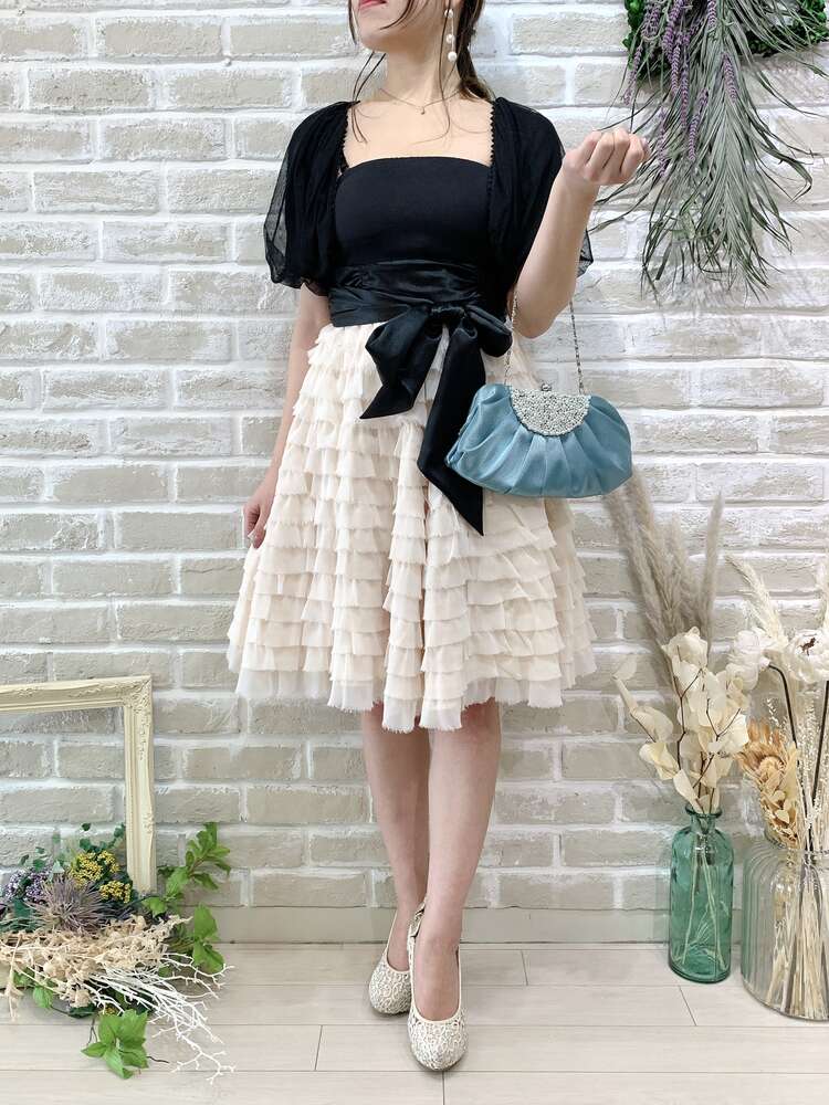 ツートーンのバイカラーが印象的なドレス。ヒップラインもカバーするふんわりスカートに異なるカラーの切替デザインは、ひきしめ・スタイルアップ効果も期待できます。また、デコルテが大きく開いたキャミソールタイプは顔周りをスッキリ見せてくれるのも嬉しいポイント。優しいアイボリーのティアードフリルスカートが華やかで、フェミニンでキュートなスタイルが好みの10~20代に。謝恩会・同窓会・女子会などのイベント・パーティーシーンにぴったりで、1枚で着たりボレロを合わせても◎。ボレロや靴にブラックを持ってくると、コーディネートにまとまりが出ておすすめです。